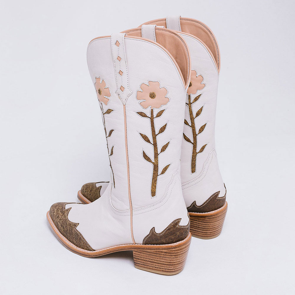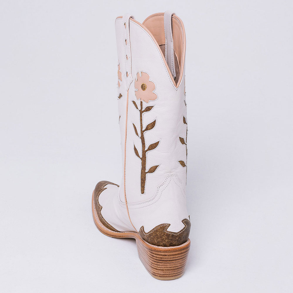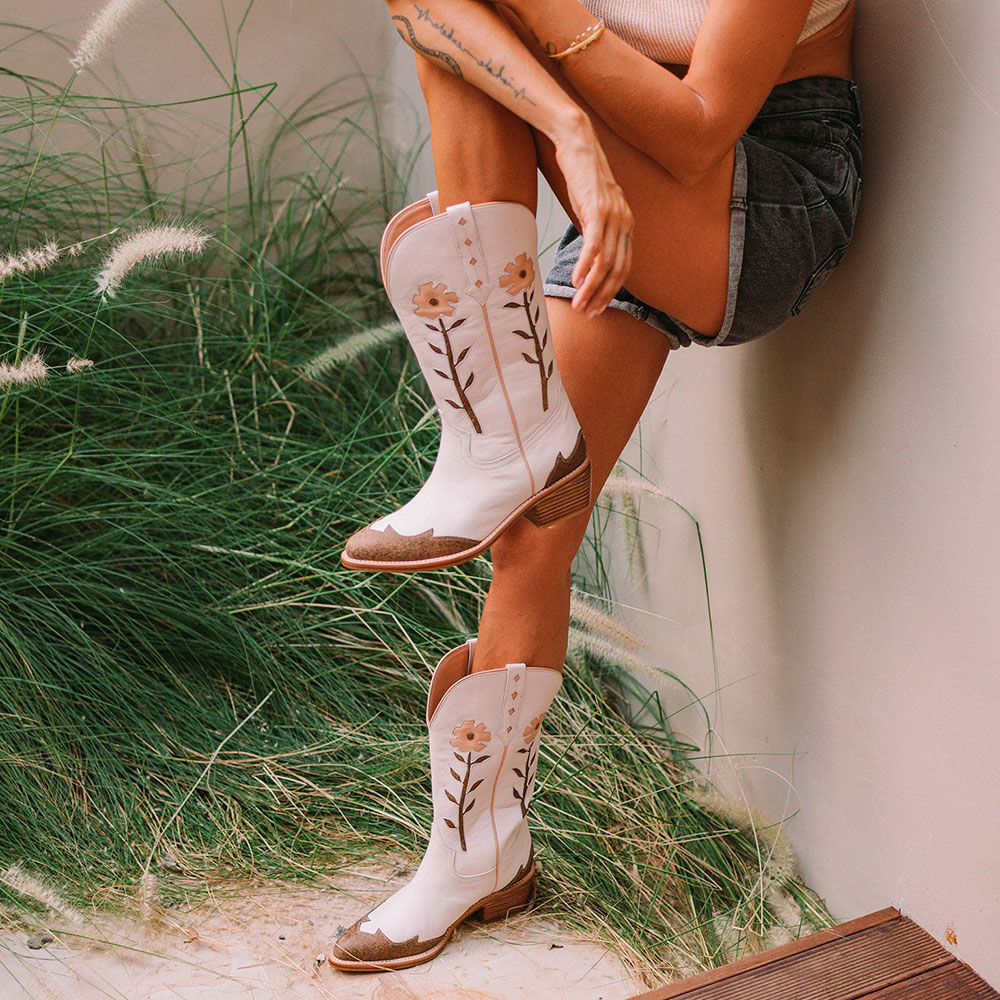 White & Brown Closed Toe Flower Inlay Mid-Calf Cowgirl Boots