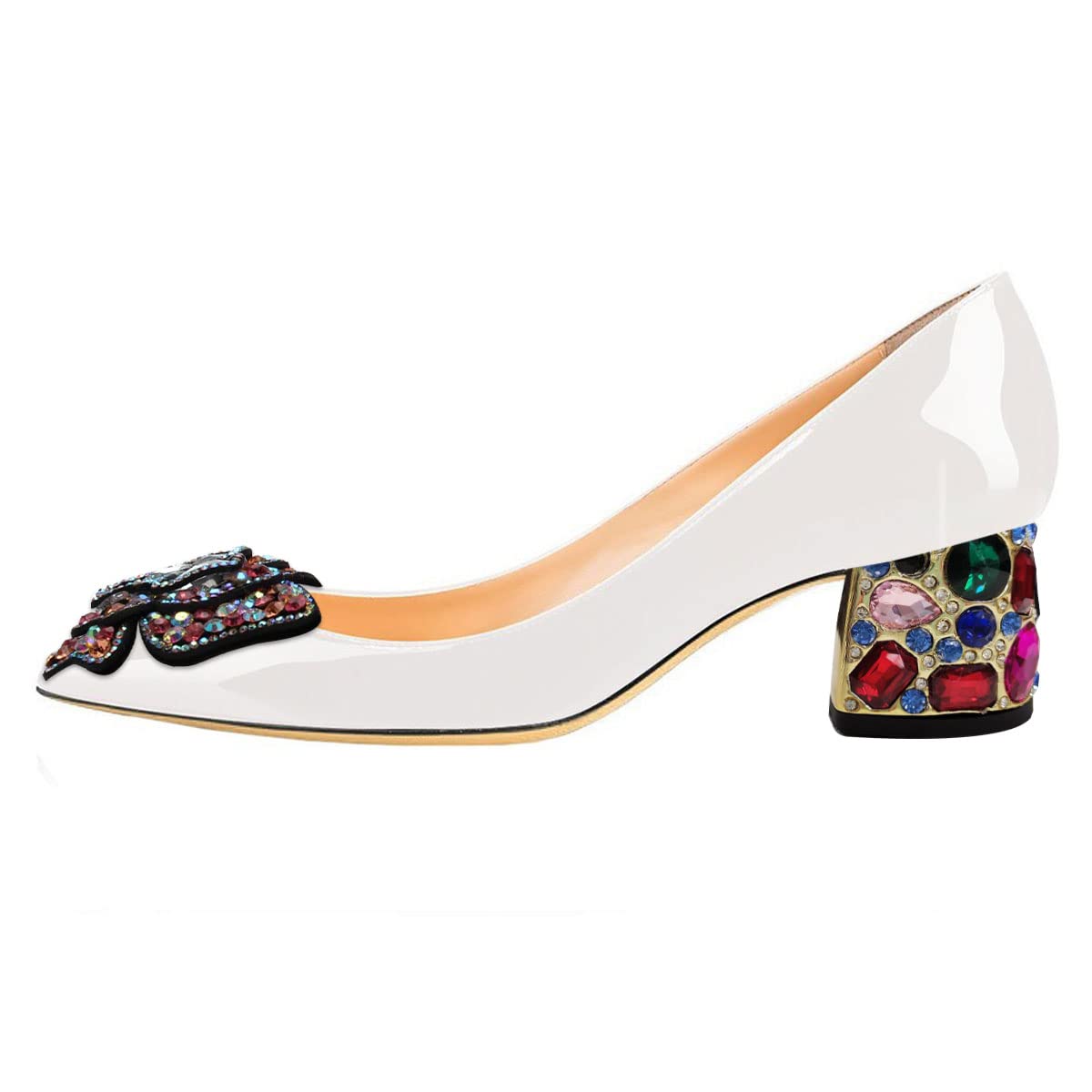 White Patent Leather Colorful Rhinestone Butterfly Block Heel Pumps