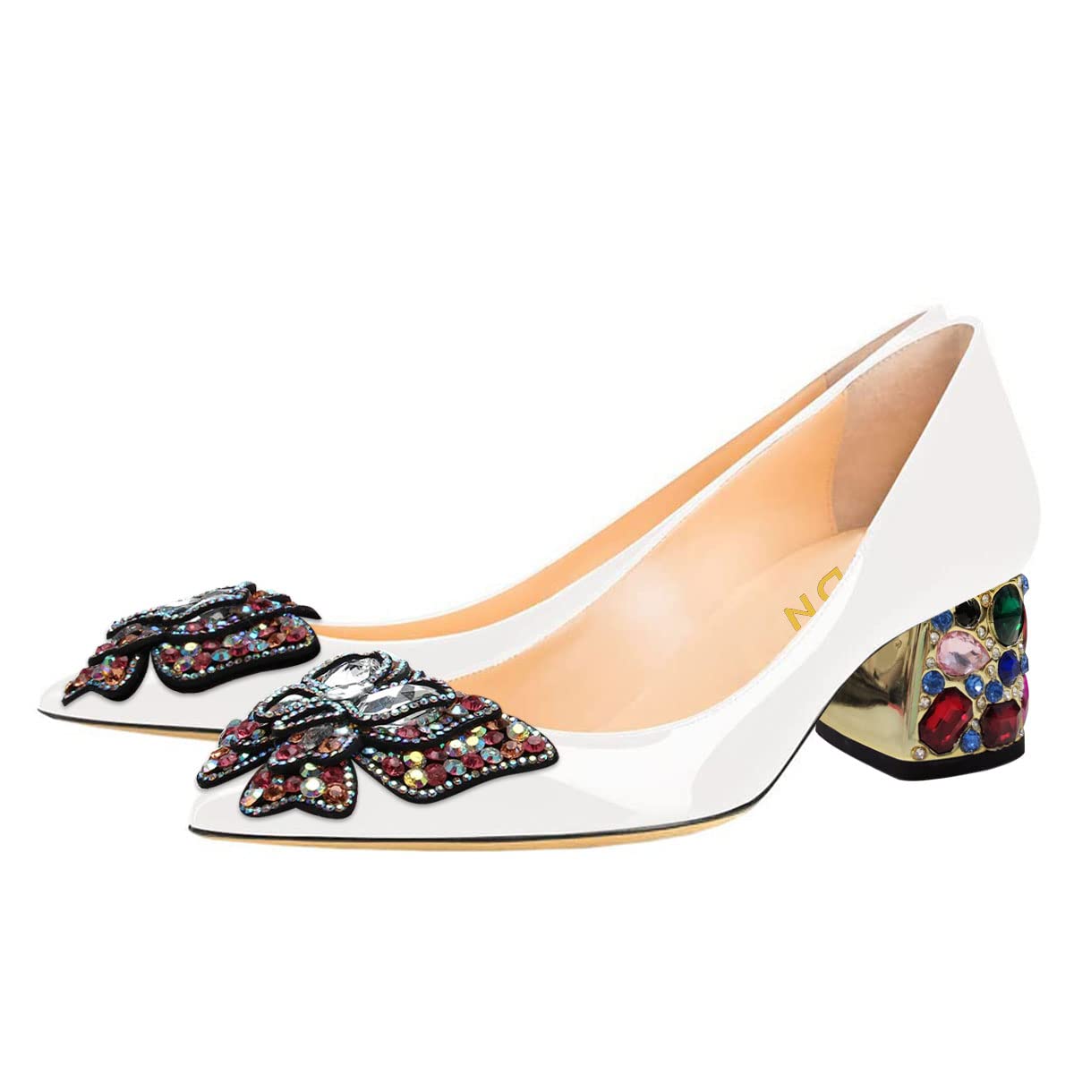 Special Designs: The elegant white pumps feature a rhinestone decorative block heel and a colorful butterfly embellishment design.