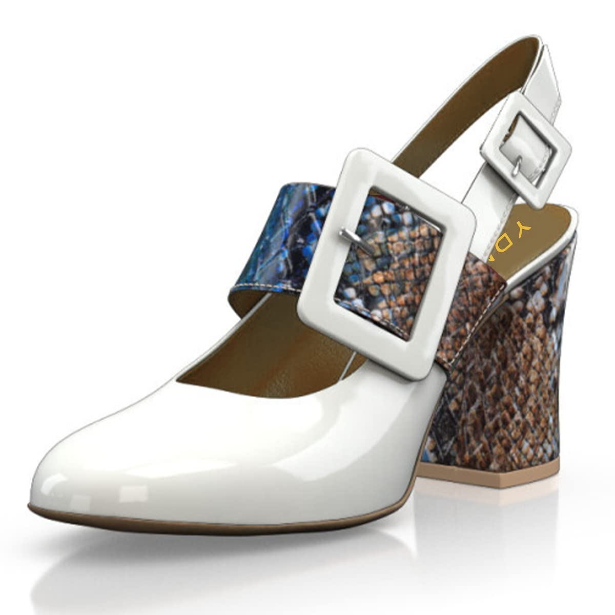 White Patent Leather Snakeskin Patchwork Buckle Slingback Chunky Heels