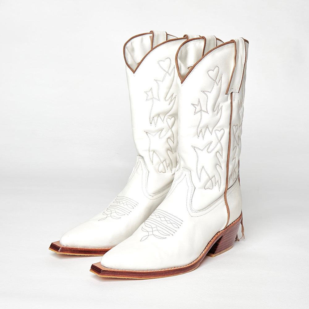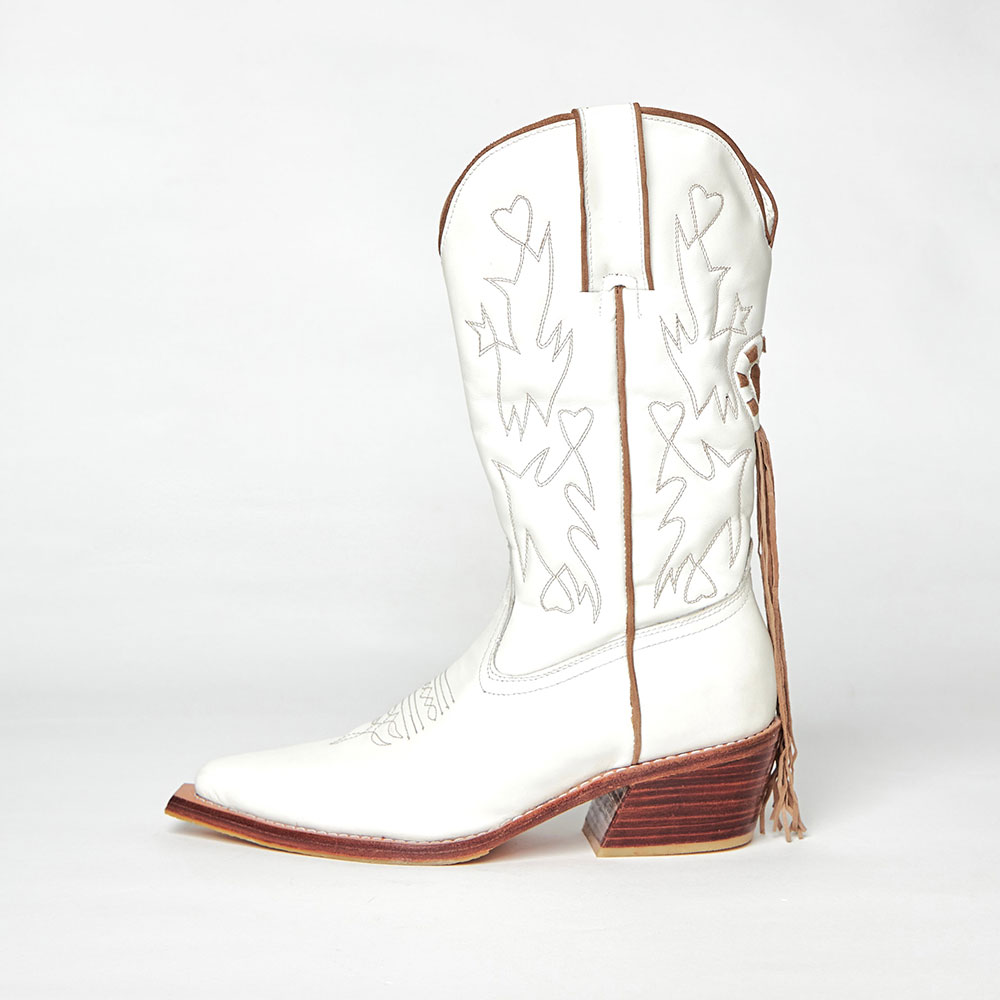 • Special Designs: The pointed-toe cowgirl boots feature brown embroidery, fringe, and a heart insert design.