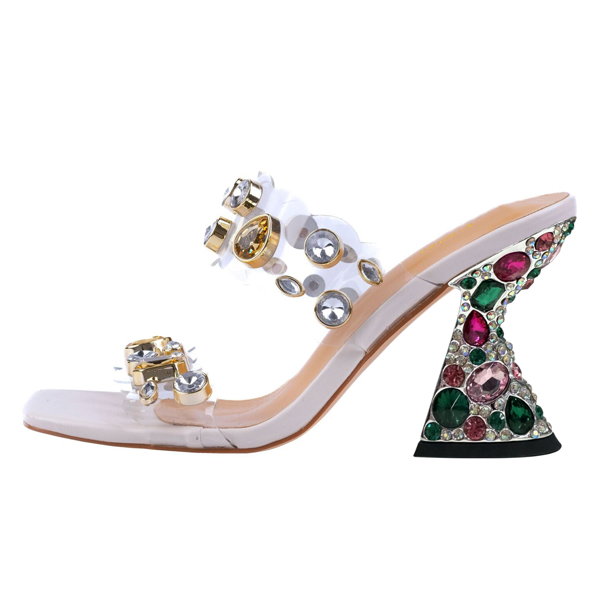 Special Designs: White mules feature rhinestone embellished clear bands and a colorful high heel.