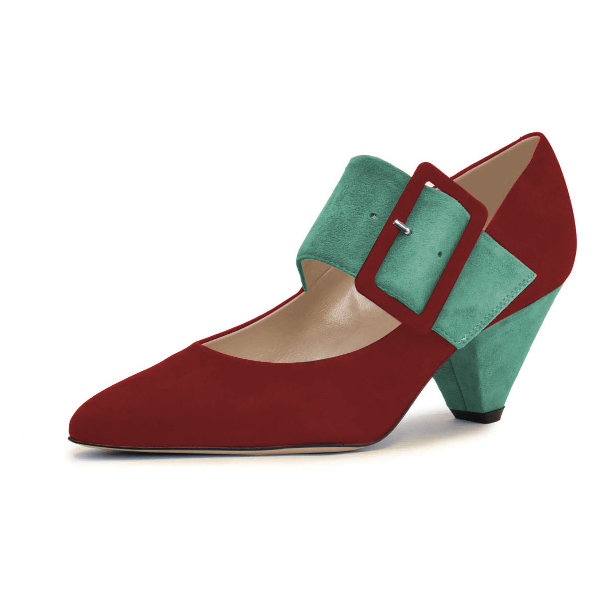 Special Designs: Wine red pumps with faux suede sophistication and a buckle fastening turquoise wide strap design