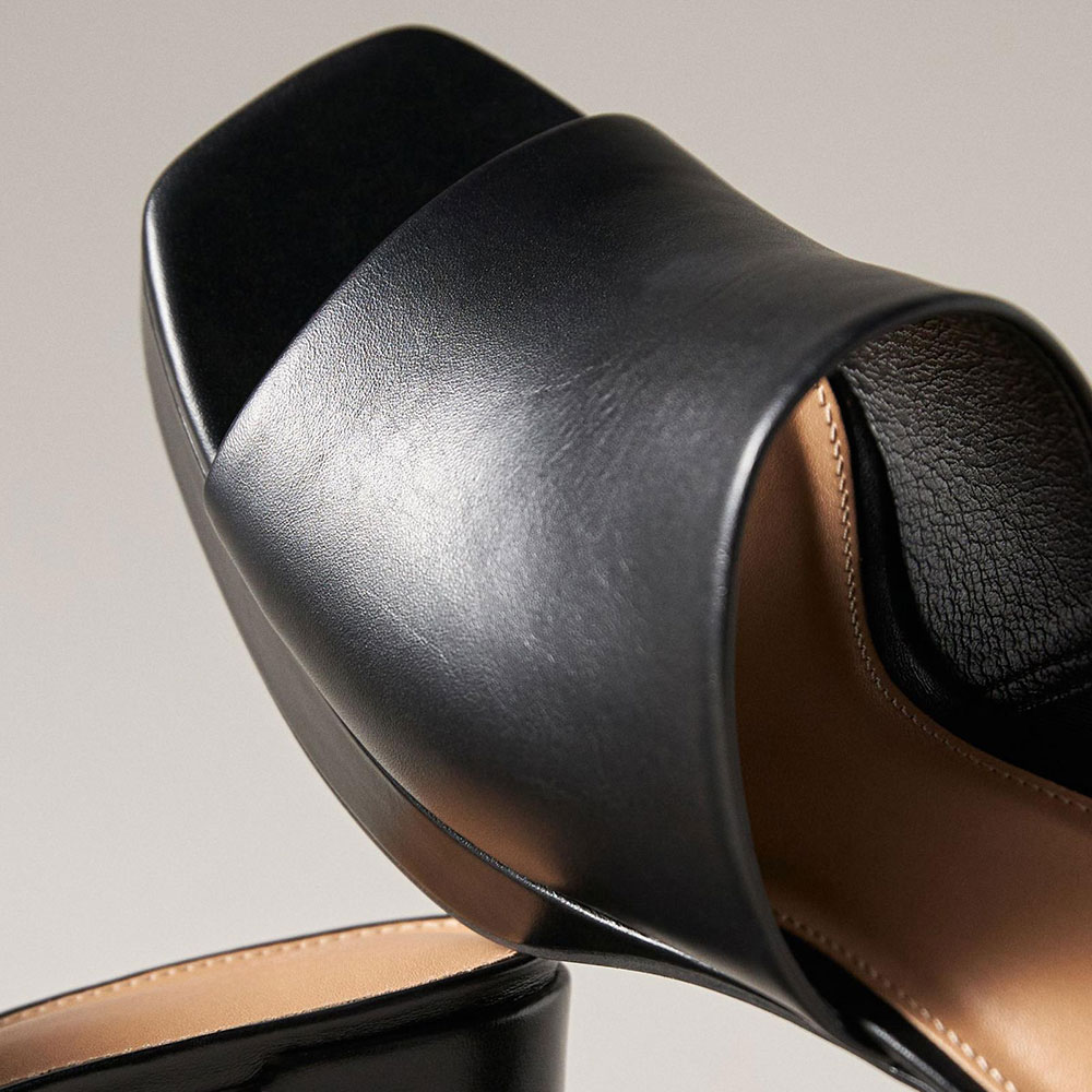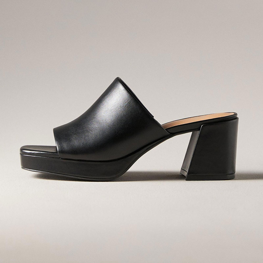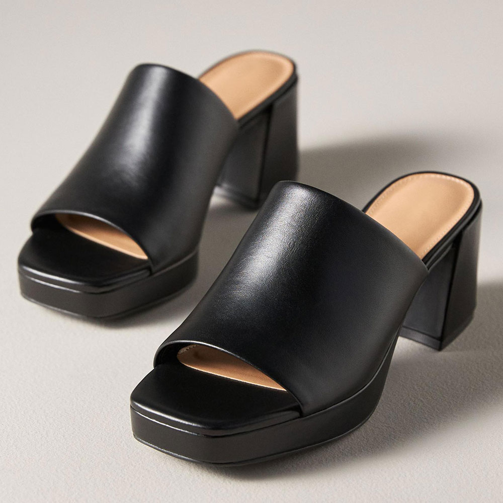 • Special Designs: The block-heeled mules feature an open square toe and a slip-on design.