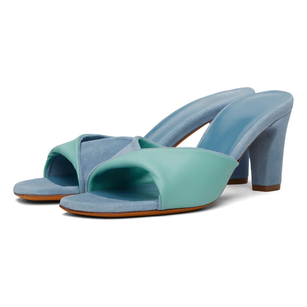 Women's Blue Open Square Toe Chunky Heel Slip On Twisted Mules Sandals