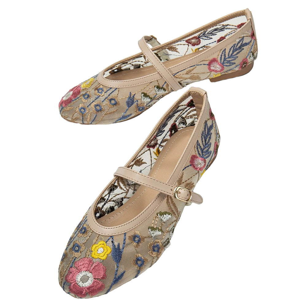 Women's Breathable Mesh Round Toe Beige Floral Mary Jane Flats