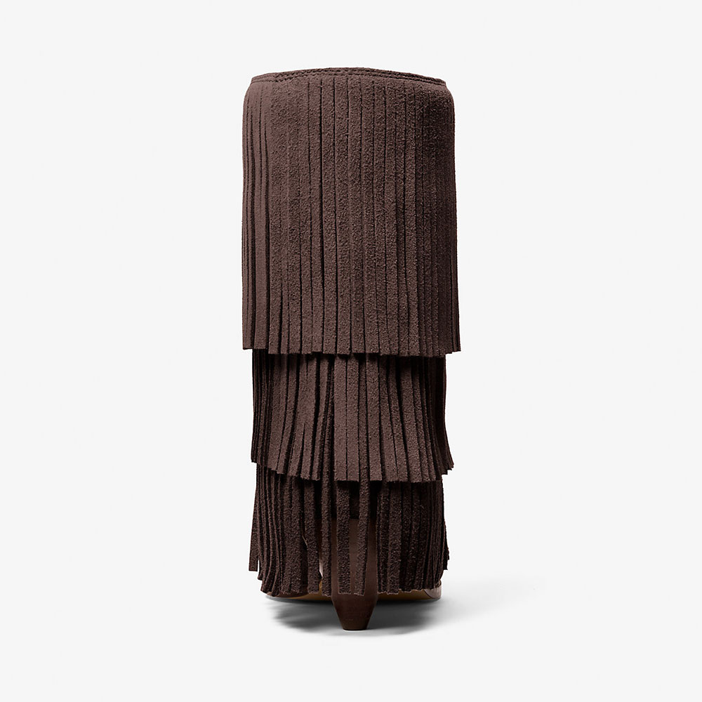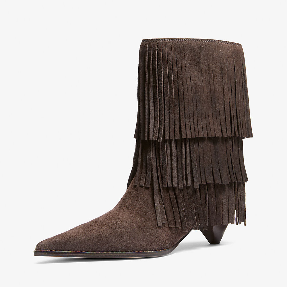 These brown vegan suede boots feature multiple layers of fringes, a pointed toe, and a low cone heel.