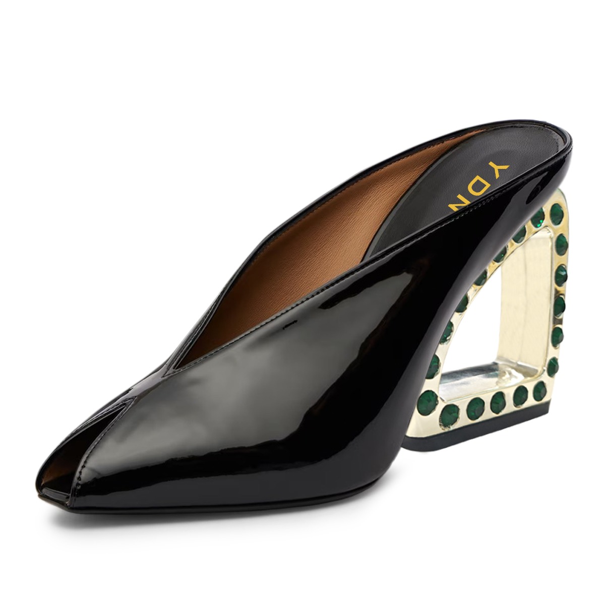 Women's Fashion Black Peep Toe Sculptural Heeled Mules with Rhinestone