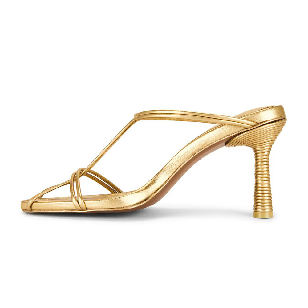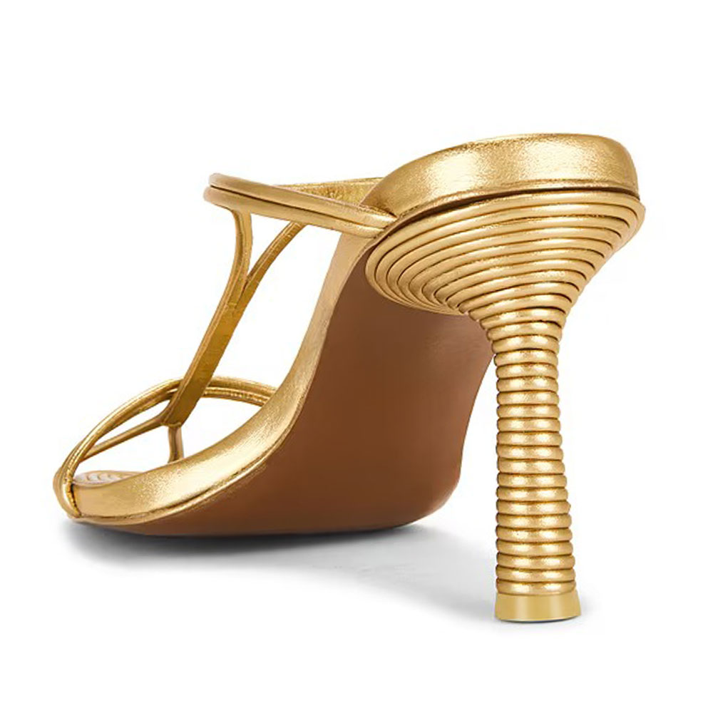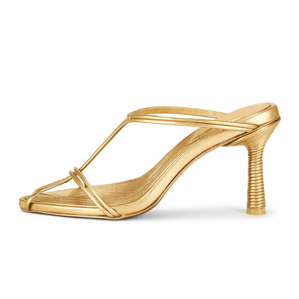 • Special Designs: The gold mules feature a pointed toe and ribbed-texture heel.