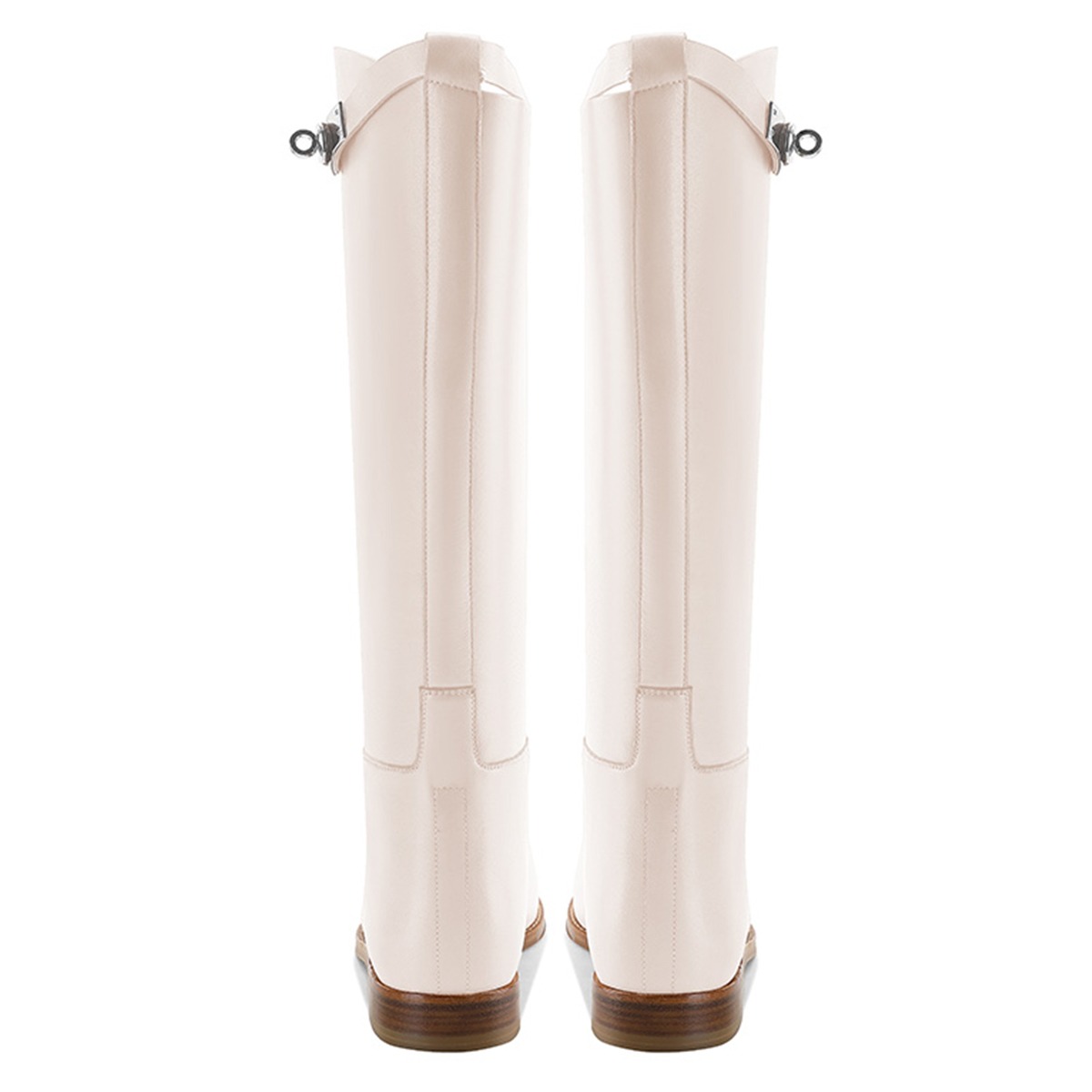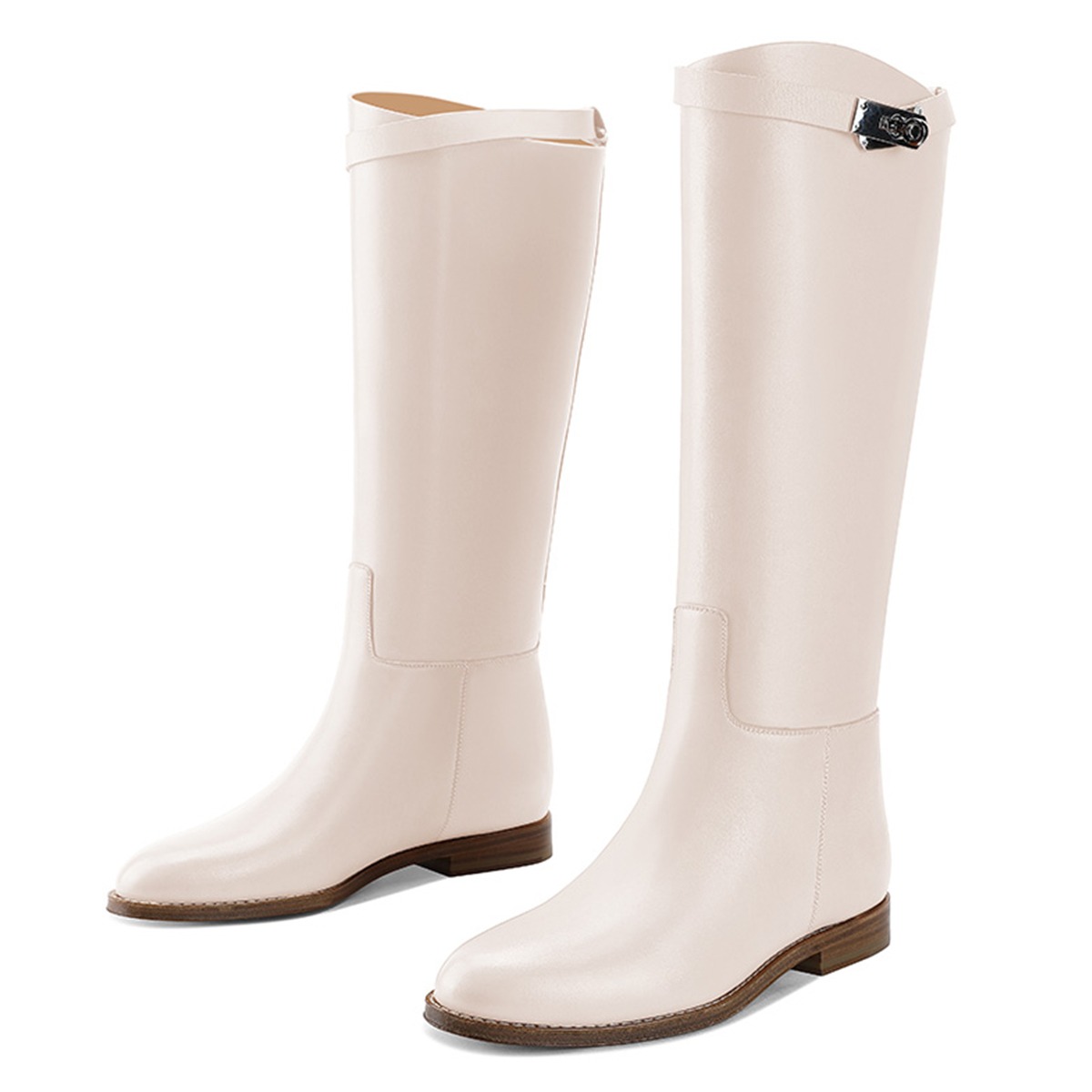 Women's Ivory Closed Toe Knee-High Slip On Flat Buckle Boots