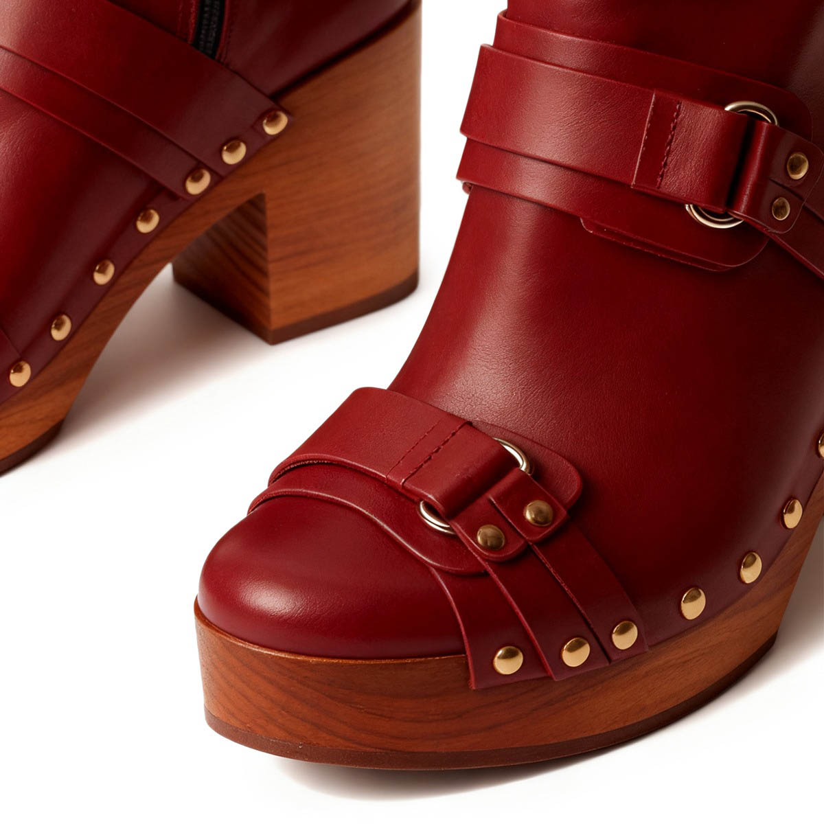 Special Designs: The ankle boots feature a sexy maroon color, a stud, a closed toe, a platform heel, and a side zipper.