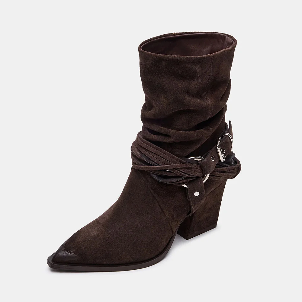 Women's Pointed Toe Chunky Heel Pull On Buckle Short Booties