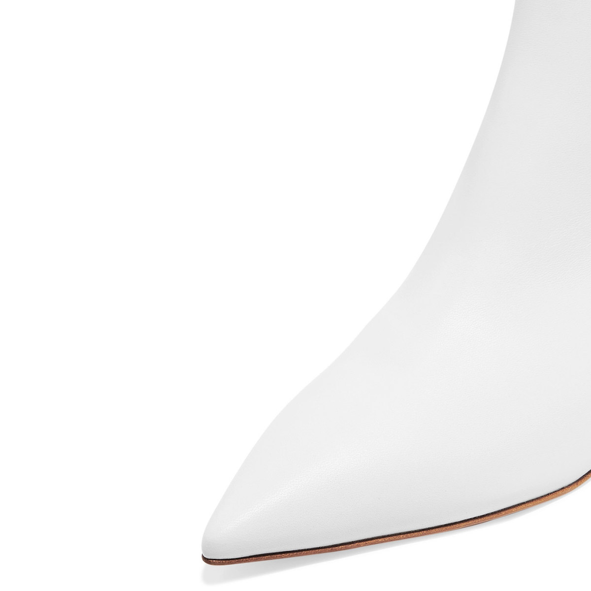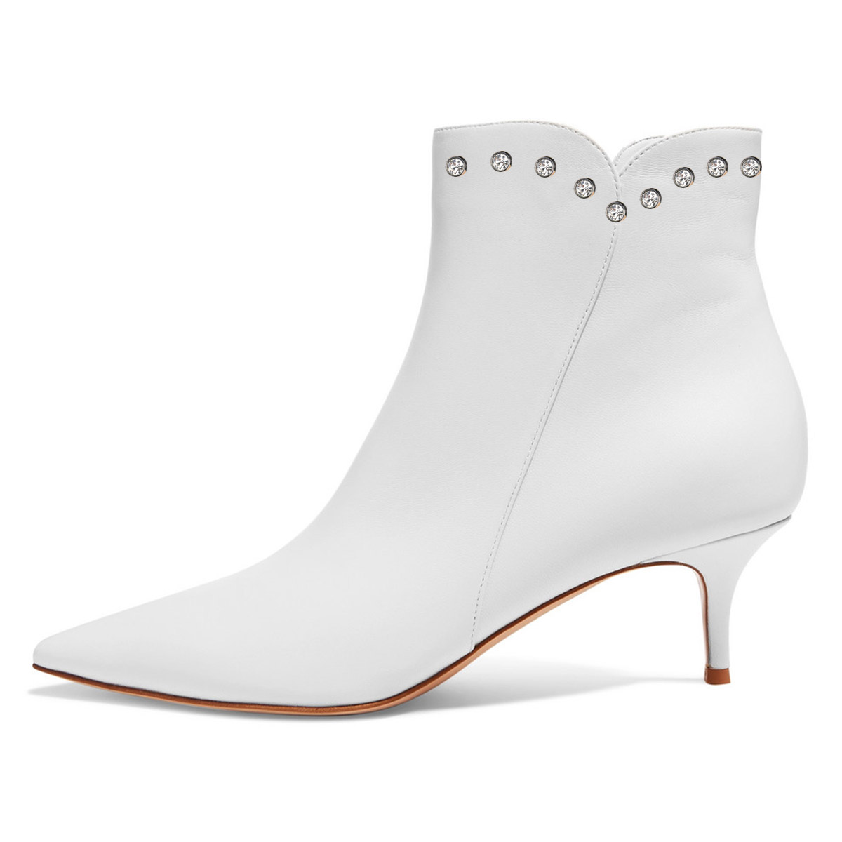 Women's Pointed Toe White Zipper Rhinestones Kitten Heeled Ankle Boots