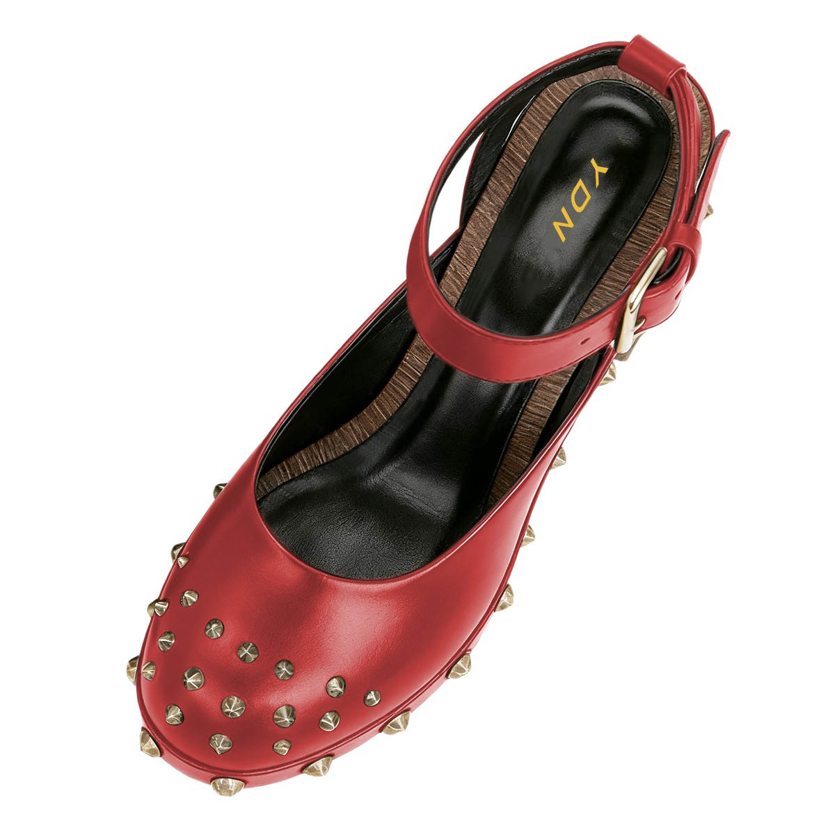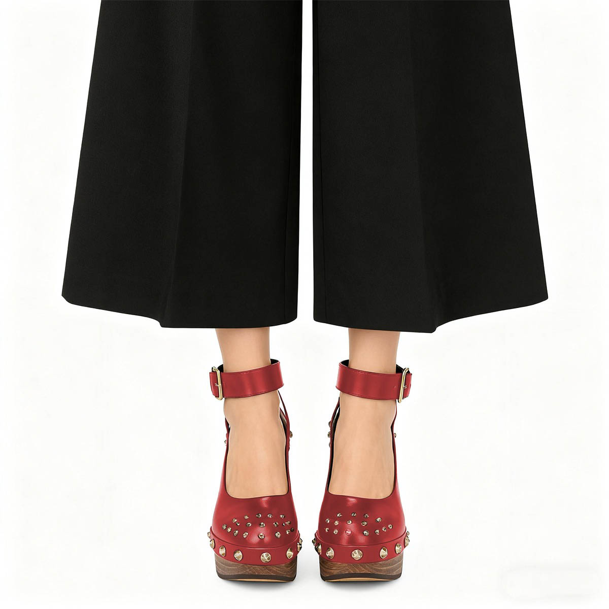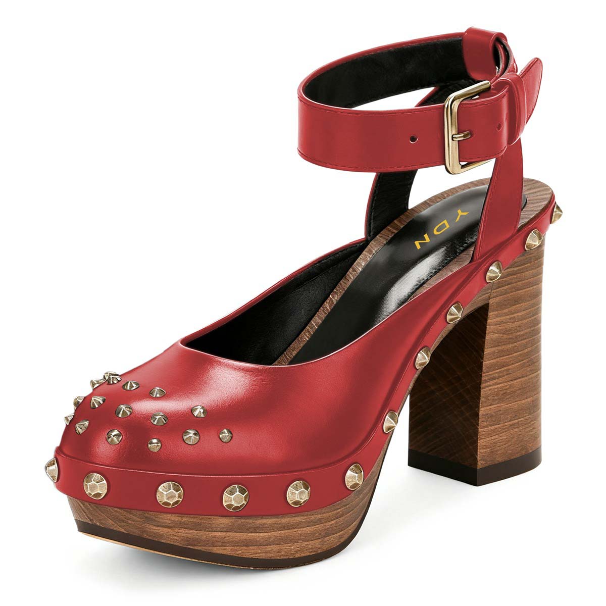 Women's Red Buckle Ankle Strap Studded Pumps Shoes with Platform
