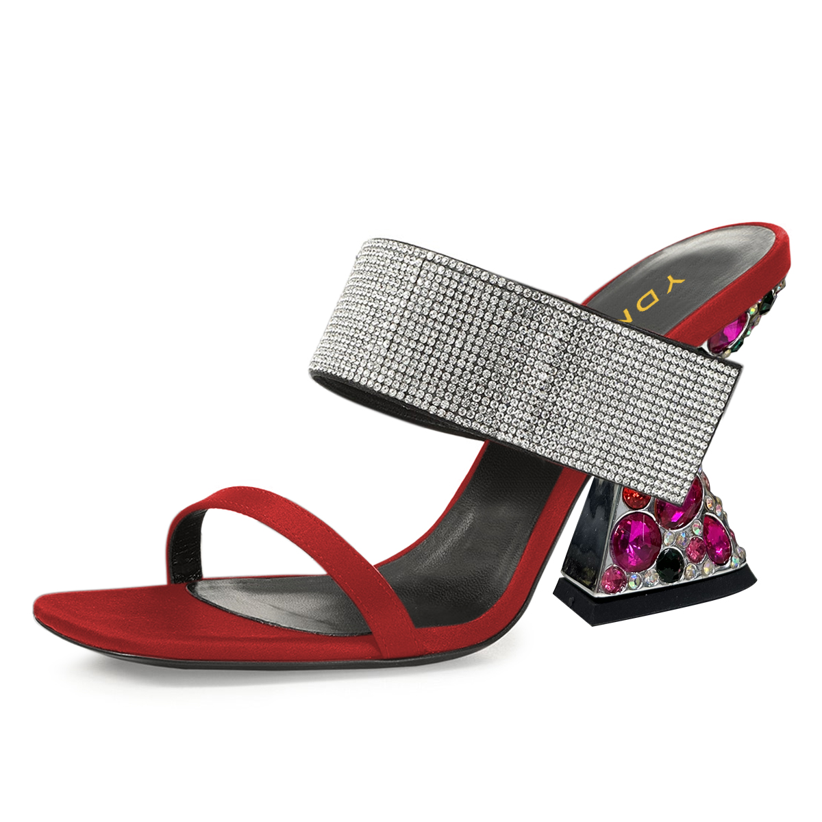 Special Designs: Red mules feature rhinestone embellished band and a colorful elegant high heel.