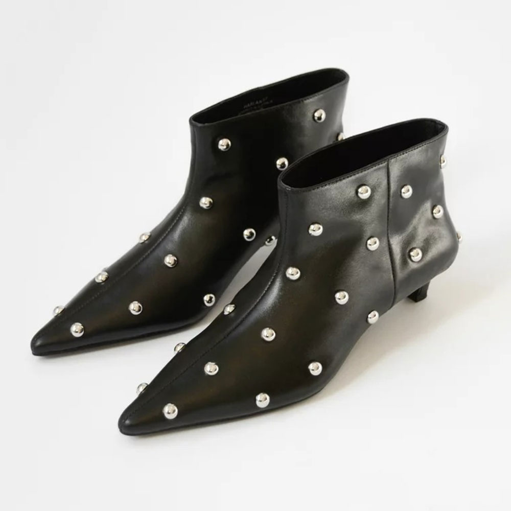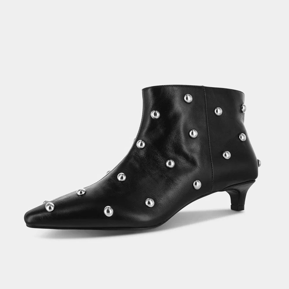 Women's Short Black Pointed Toe Studded Slip On Kitten Heel Boots