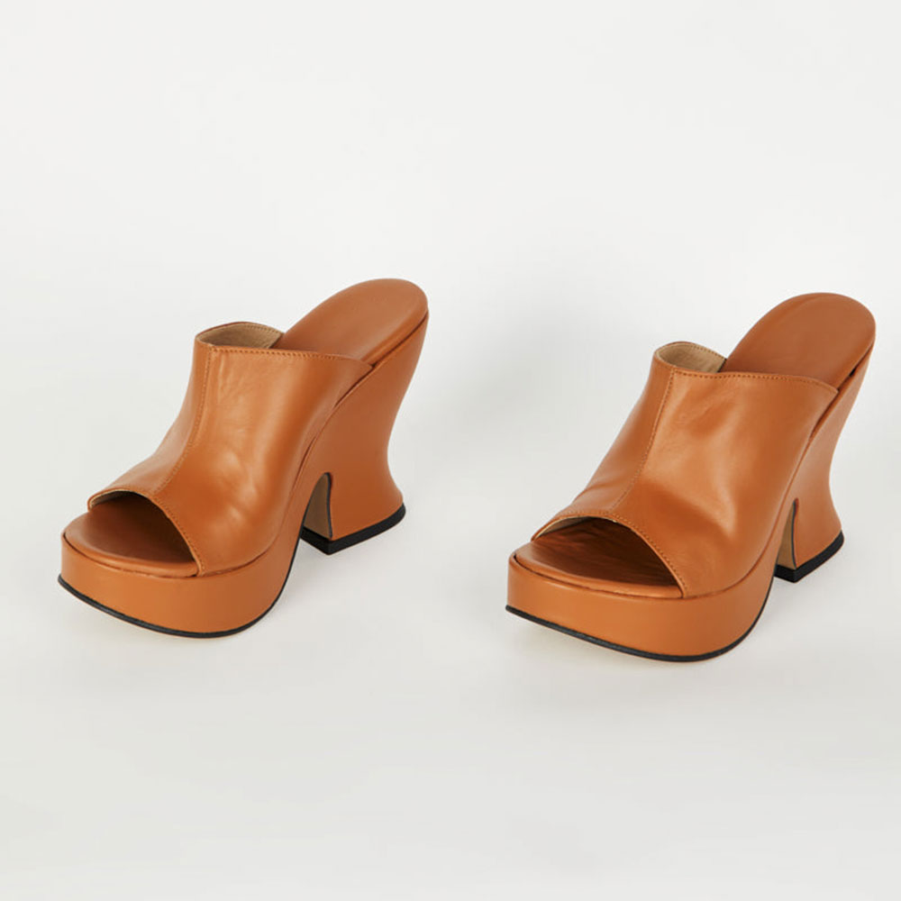 • Special Designs: These mules feature a round toe, a sculptural platform heel, a wide strap, and a slip-on design.