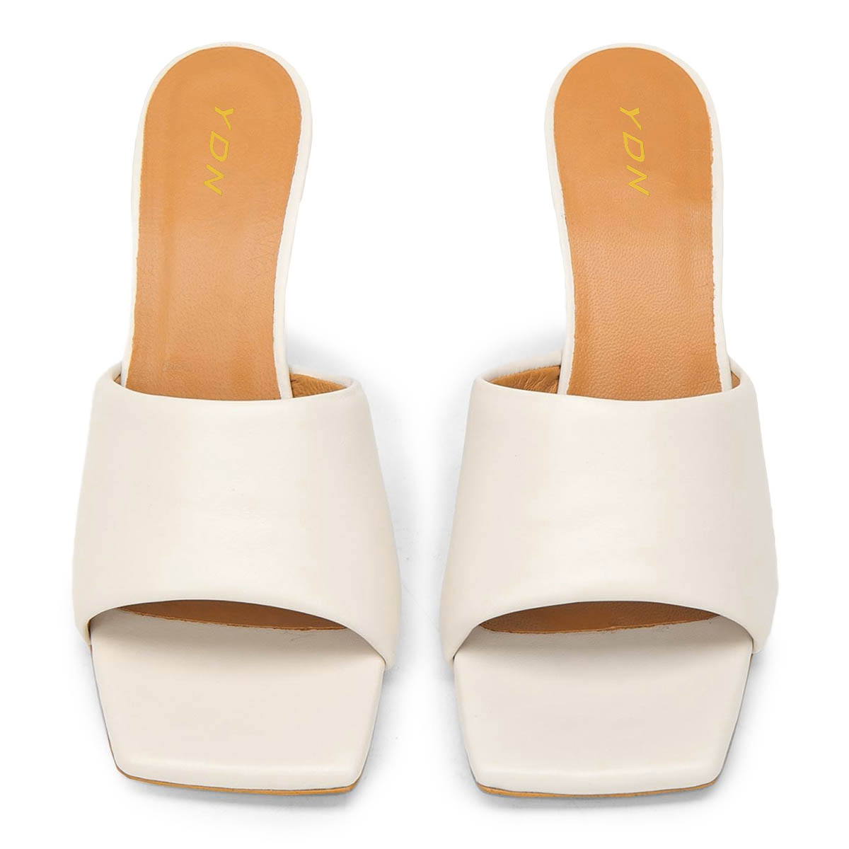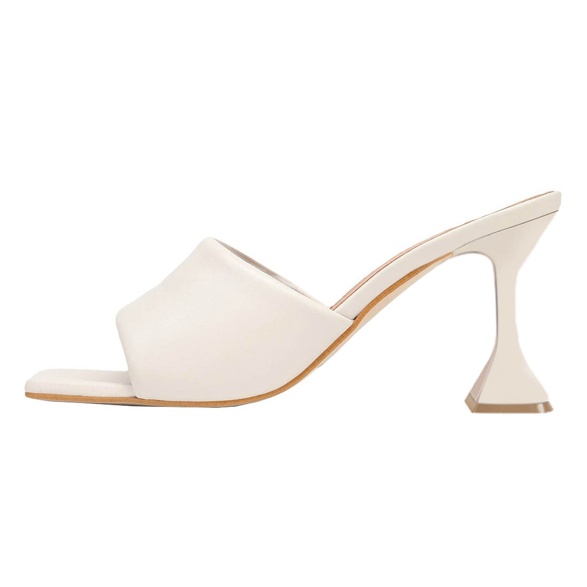 • Special Designs: Ivory mules feature a wide band and an elegant high heel.