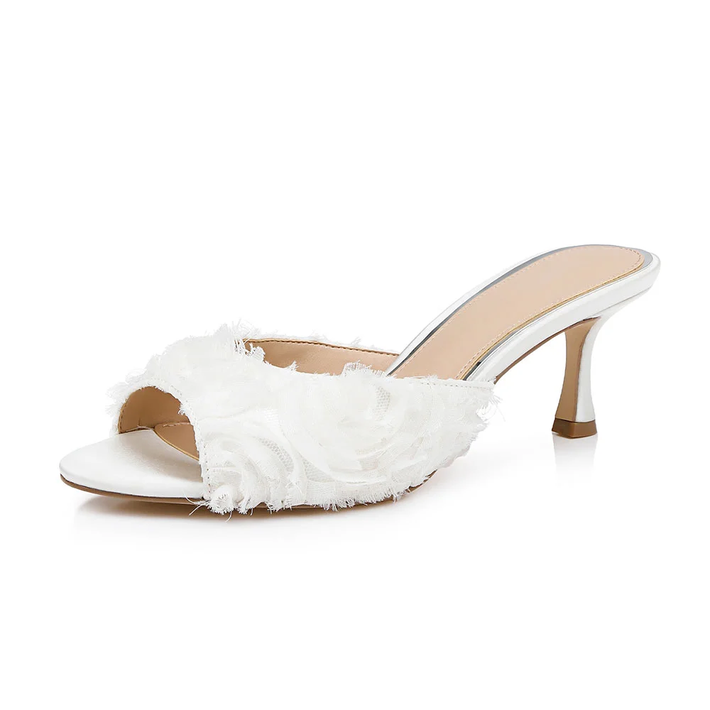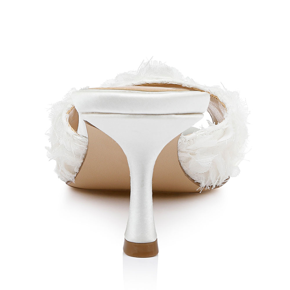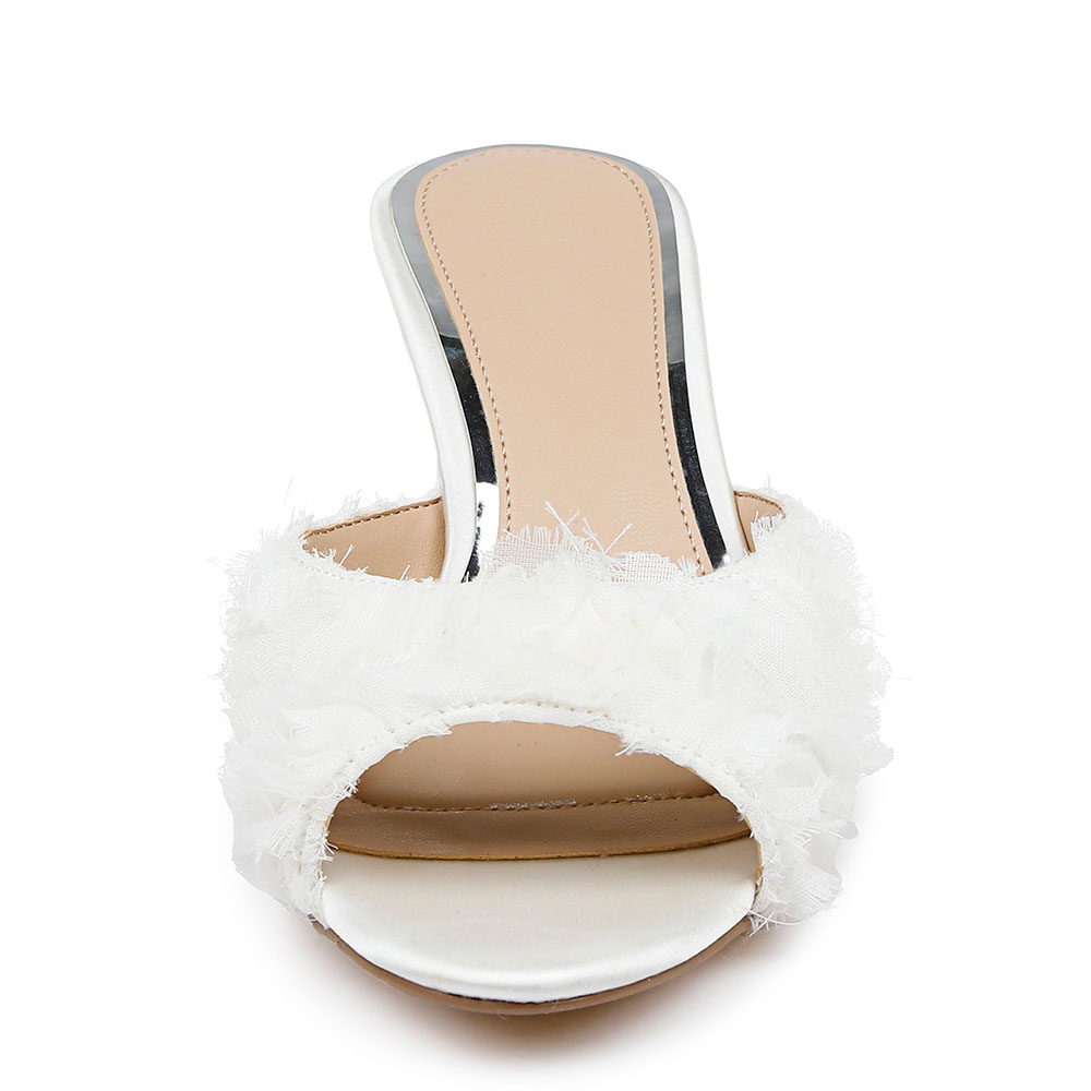 Women's White Satin Peep Toe Comfortable Heeled Mules with Ruffle