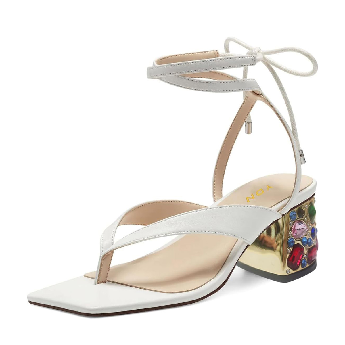 Women's White Square Toe Flip Flop Rhinestone Heeled Summer Sandals
