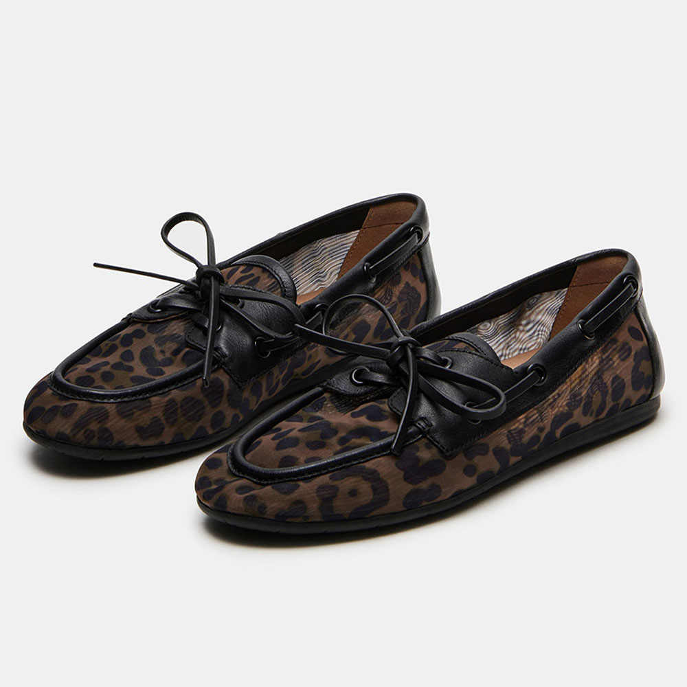 Special Designs: The round-toe flat loafer shoes feature a leopard print design and a lace-up closure.