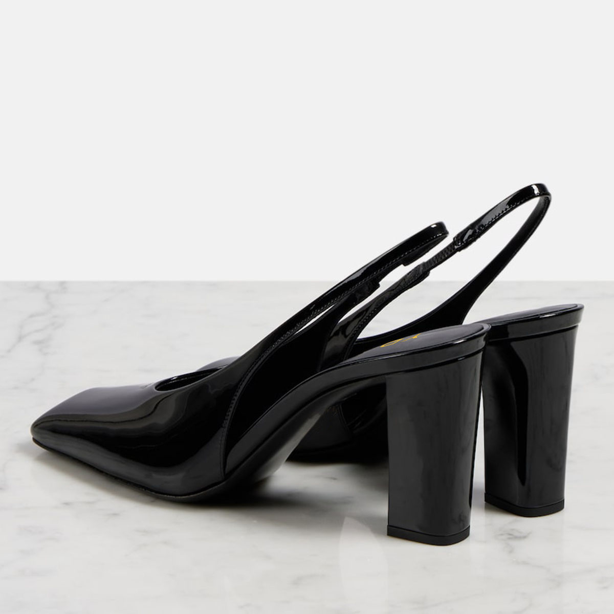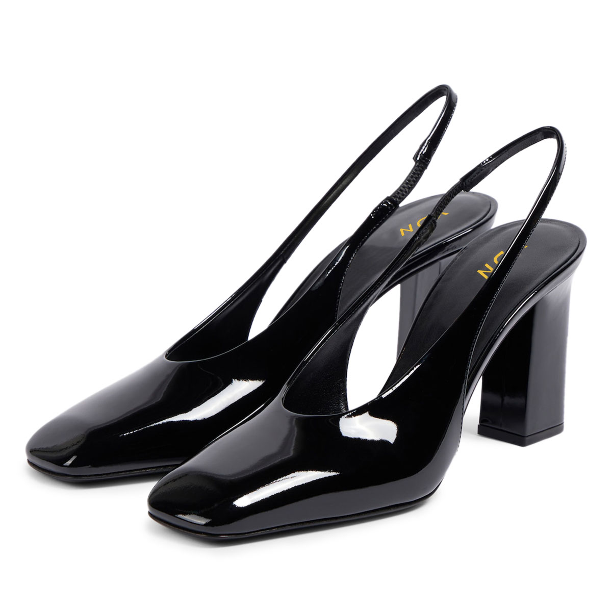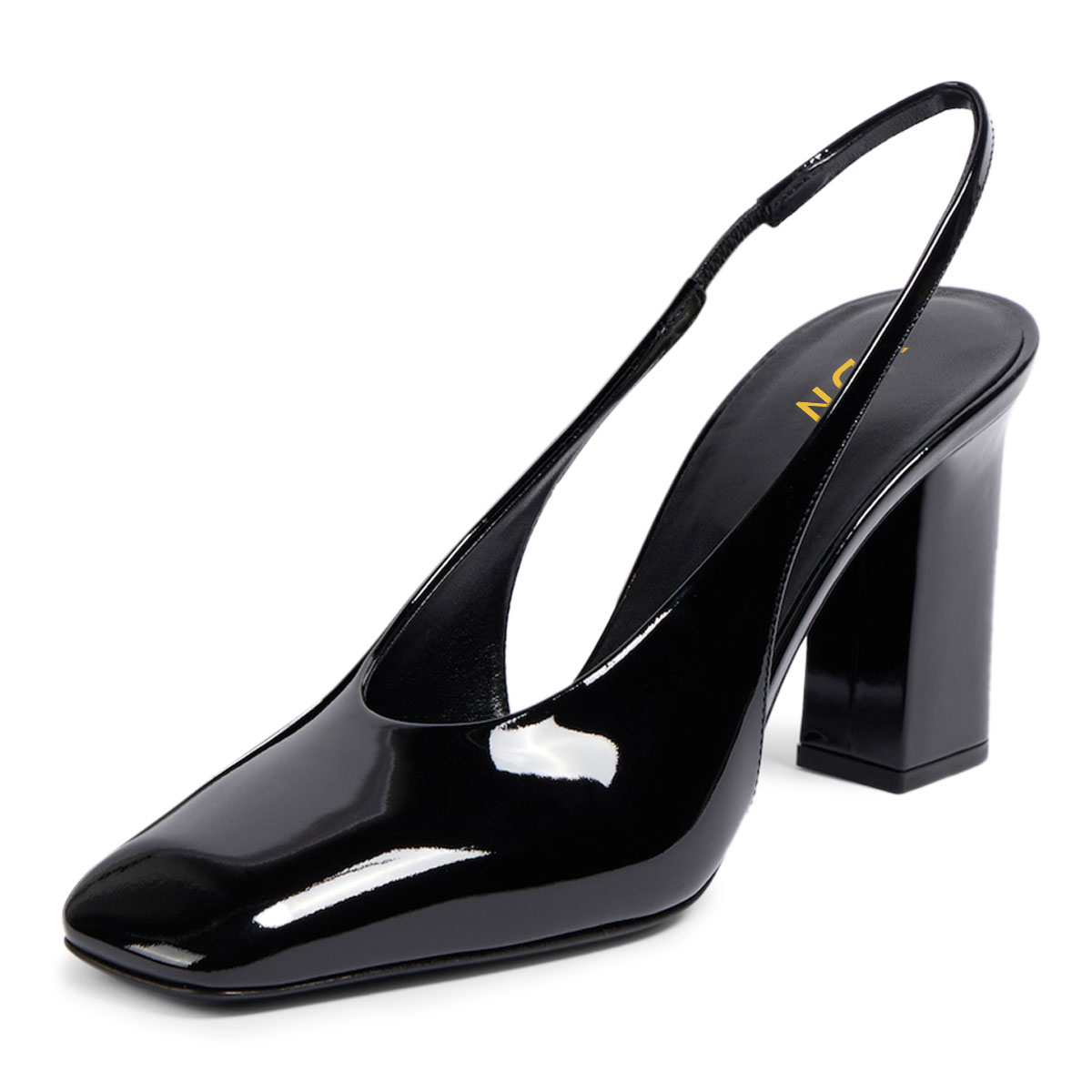 YDN Black Patent Leather Square Toe Chunky Heel Slingback Pumps