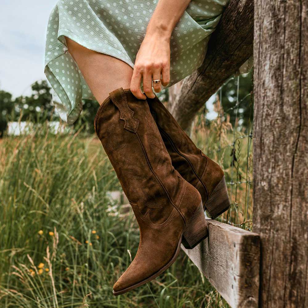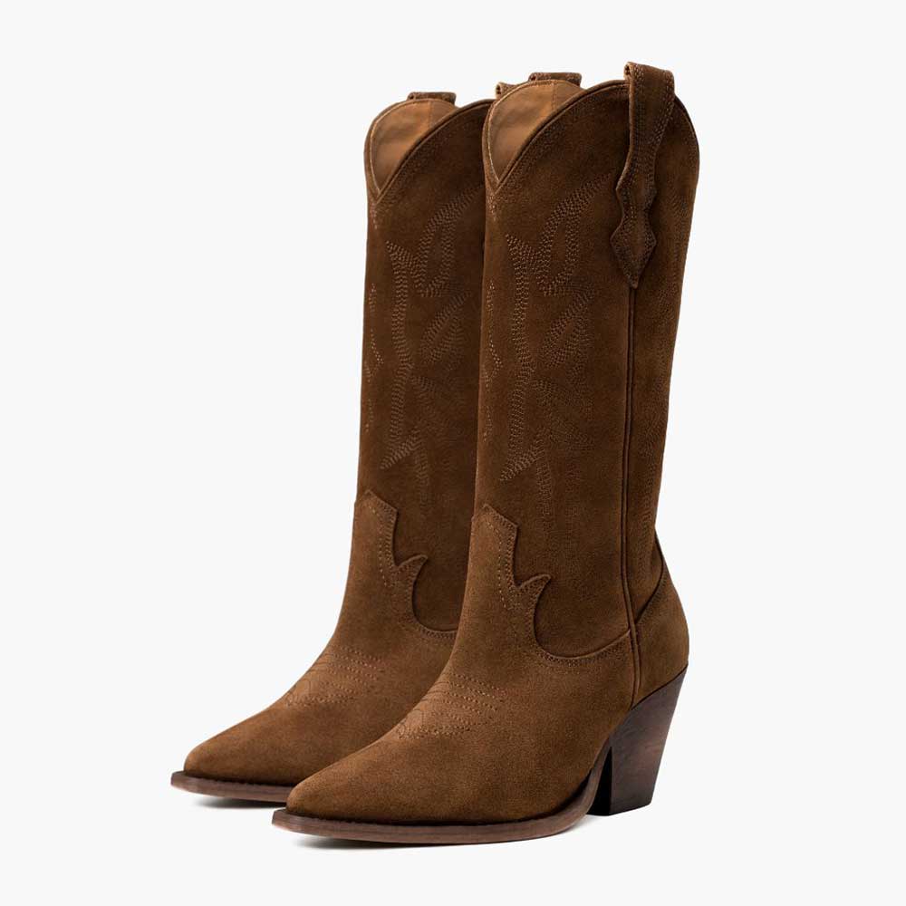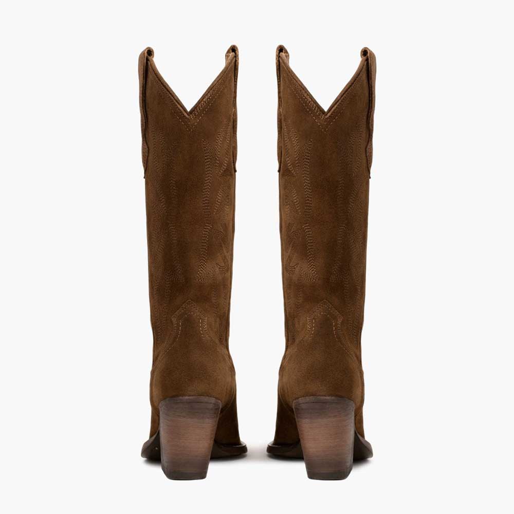 YDN Brown Pointed Toe Vegan Suede Chunky Heel Cowboy Boots for Women