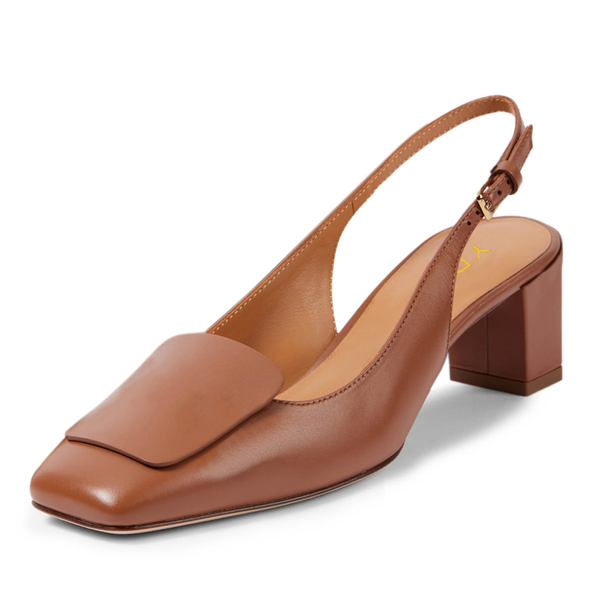 Special Designs: The square-toe slingback pumps feature a buckle strap and a comfortable chunky heel.