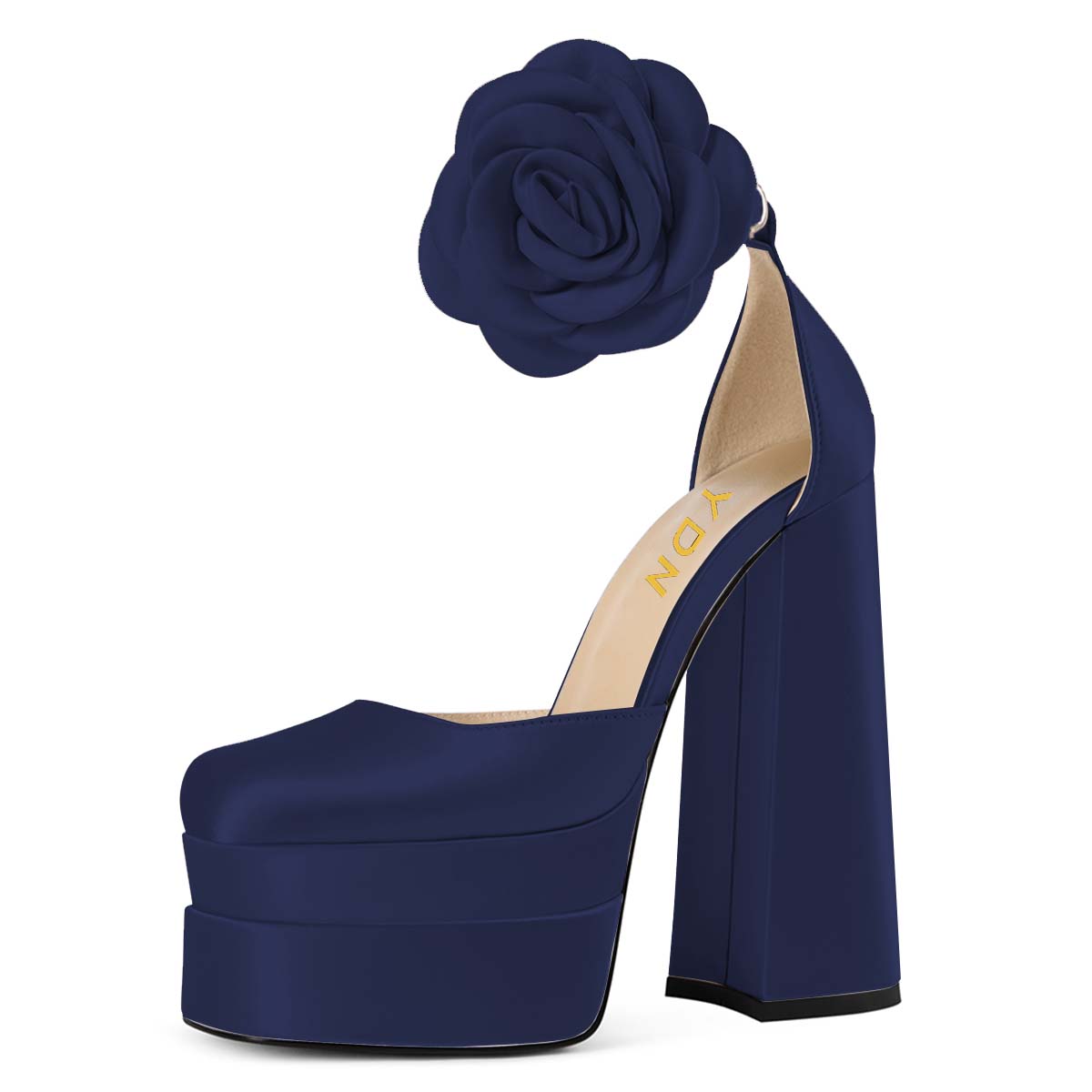 YDN Chic Navy Satin Square Toe Flower Ankle Strap Platform Heels