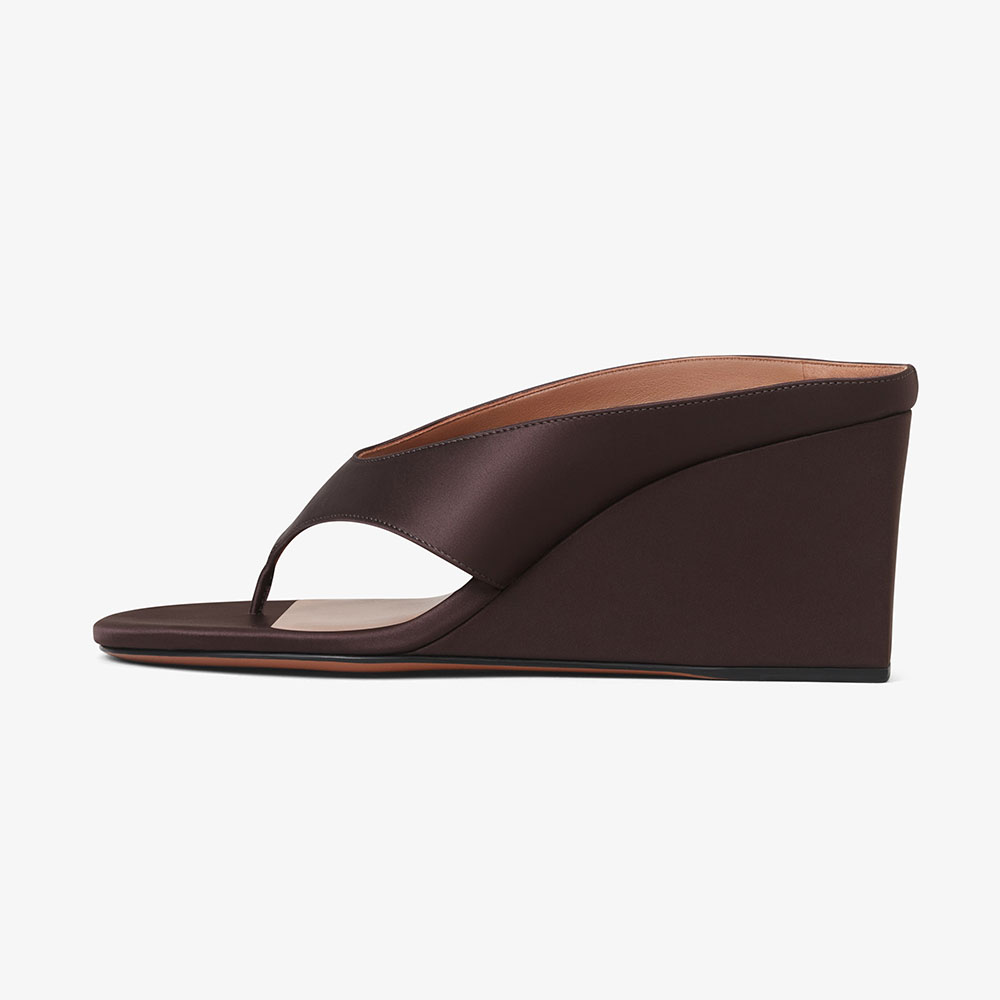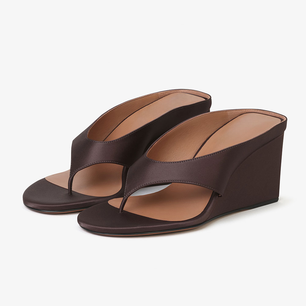 YDN Dark Brown Satin Open Round Toe Slip-On Wedge Sandals