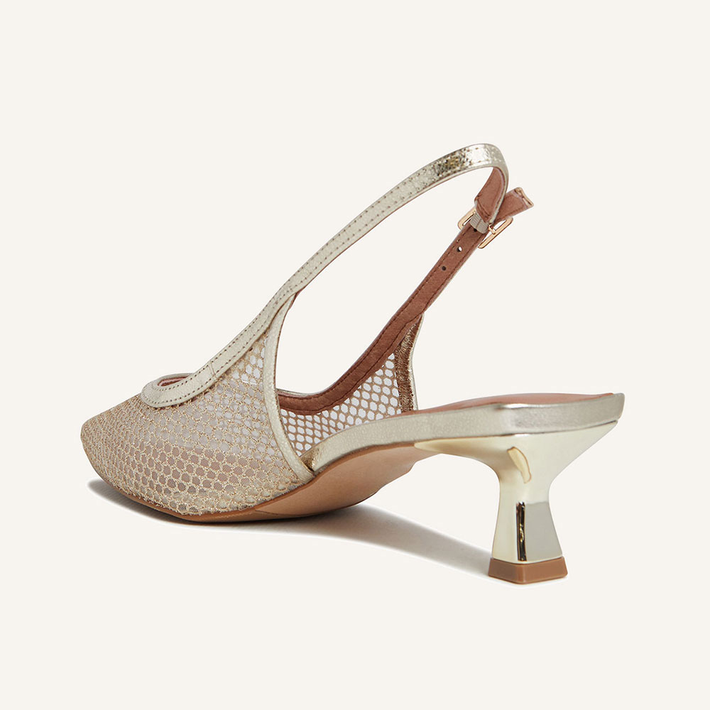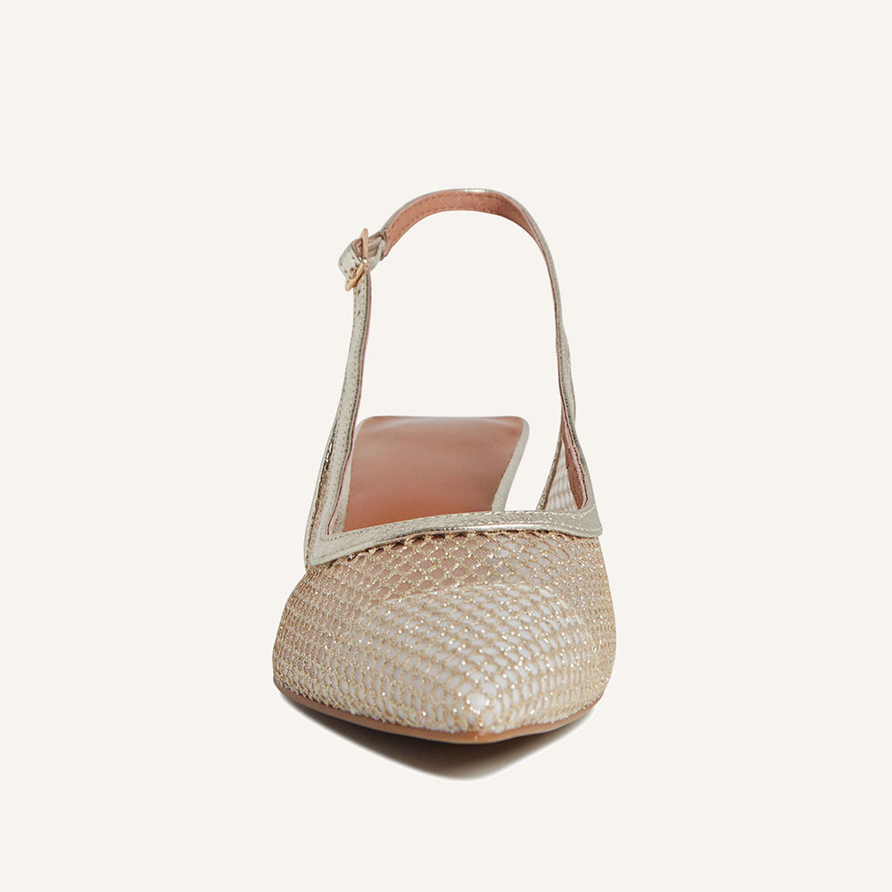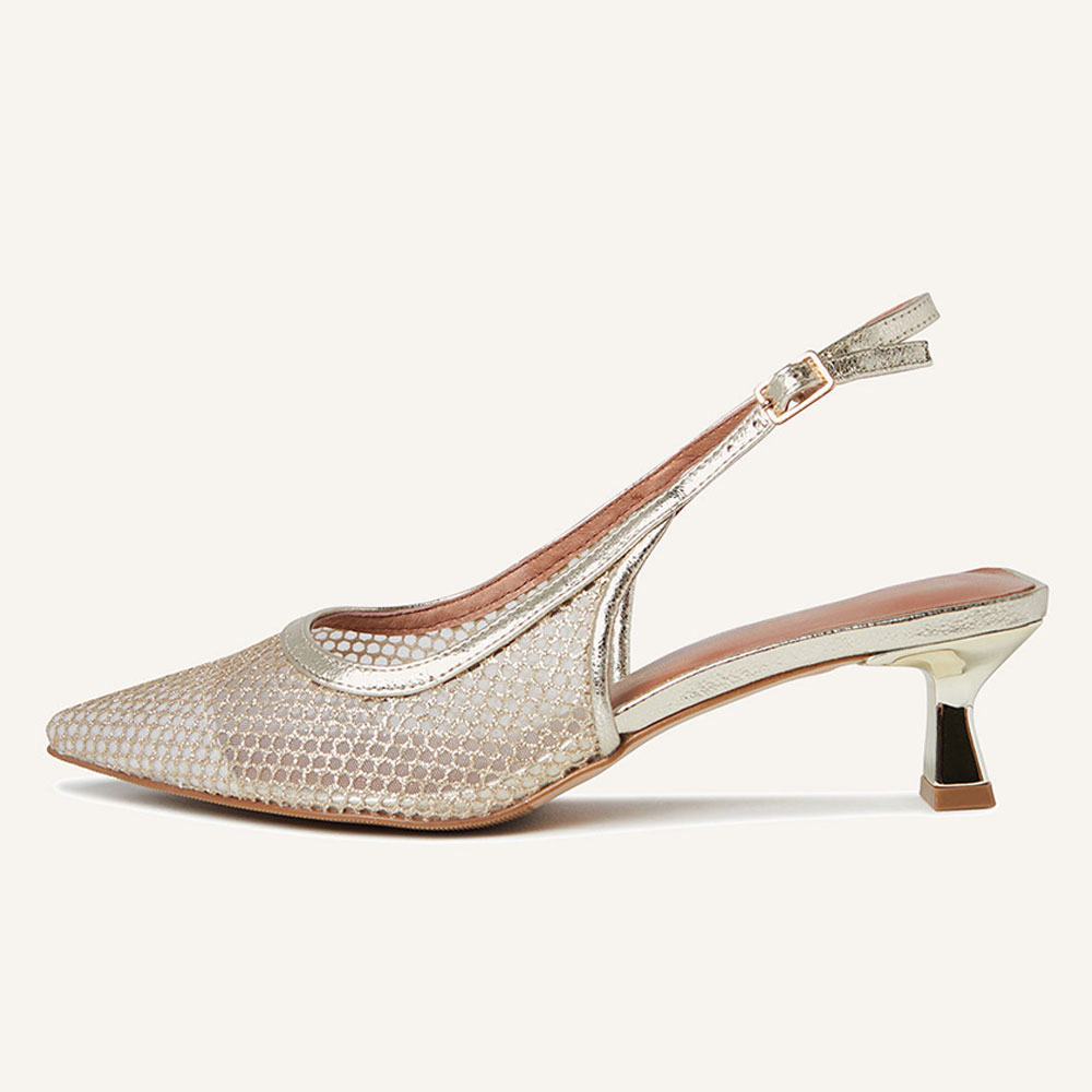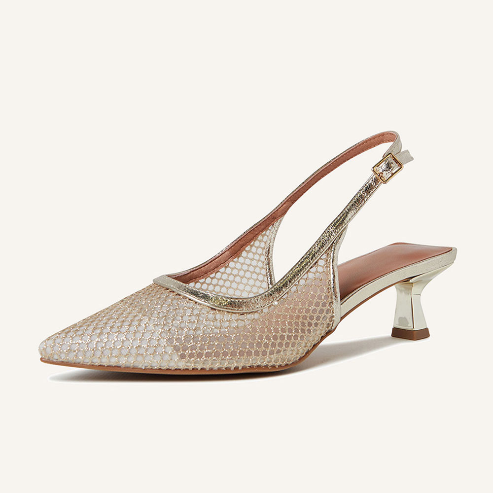 YDN Gold Glitter Mesh Pointed Toe Kitten Heel Slingback Pumps
