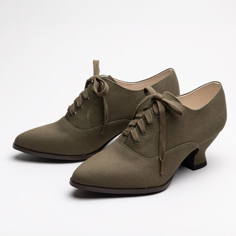 YDN Olive Canvas Tie-Up Spool Heel Almond Toe Oxford Shoes Women