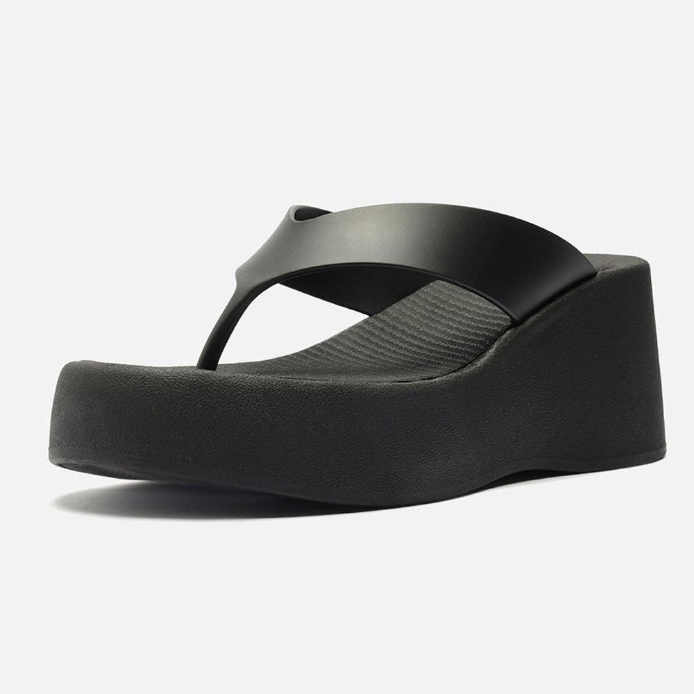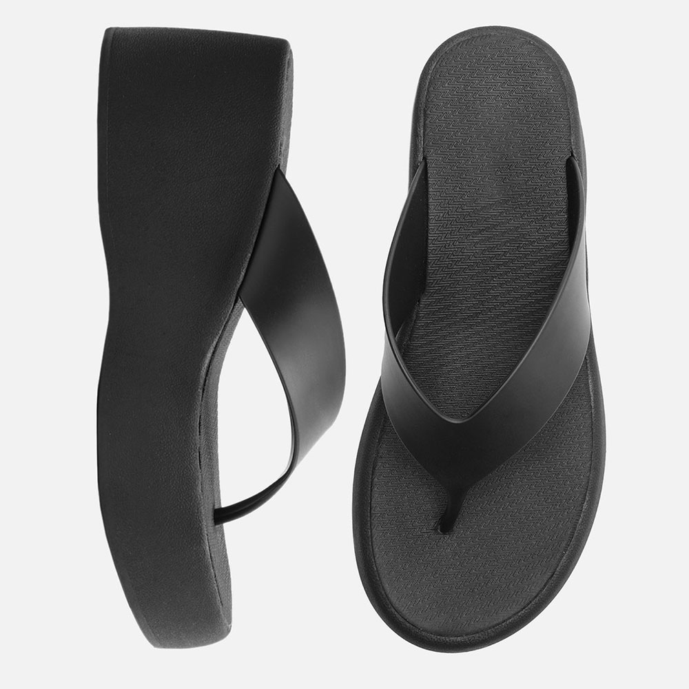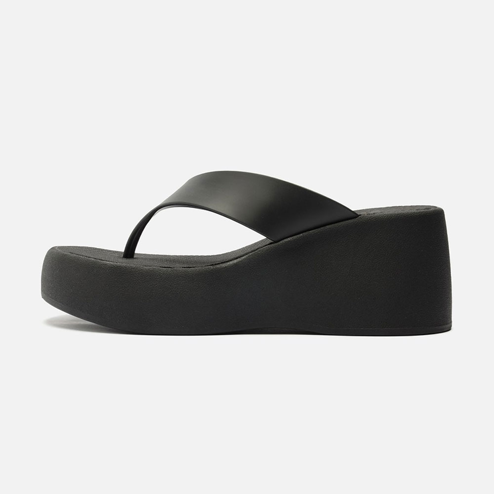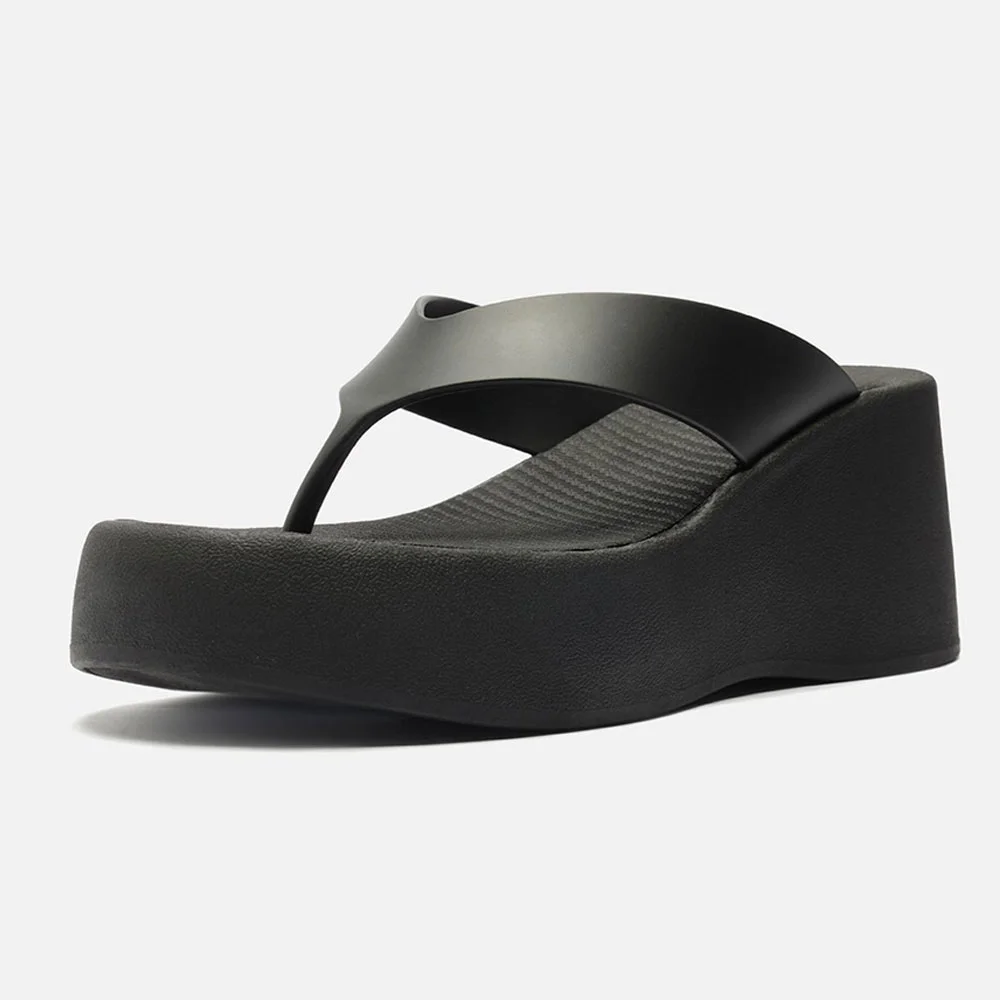 YDN Open Round Toe Wedge Heel Flip Flop Black Platform Sandals