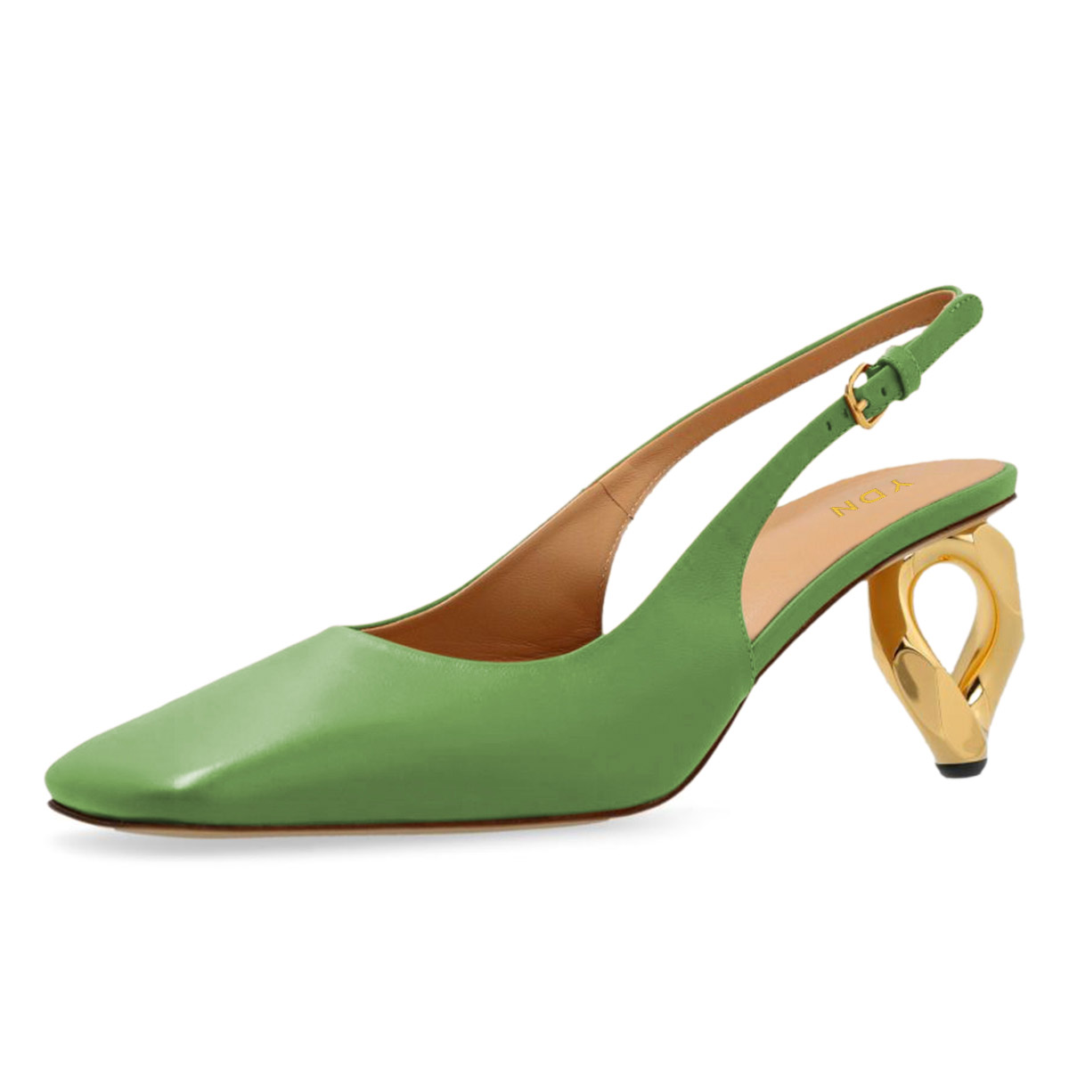 YDN Simple Green Square Toe Sculptural Heel Slingback Pumps