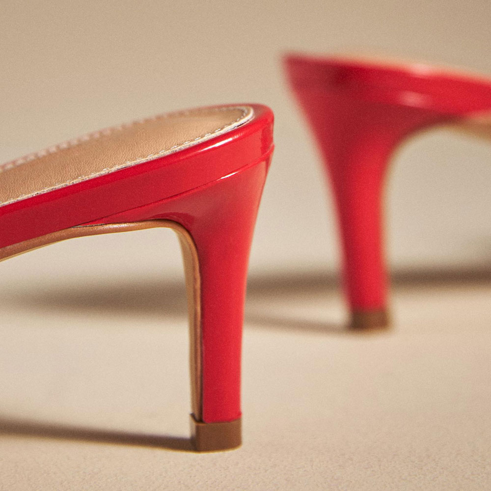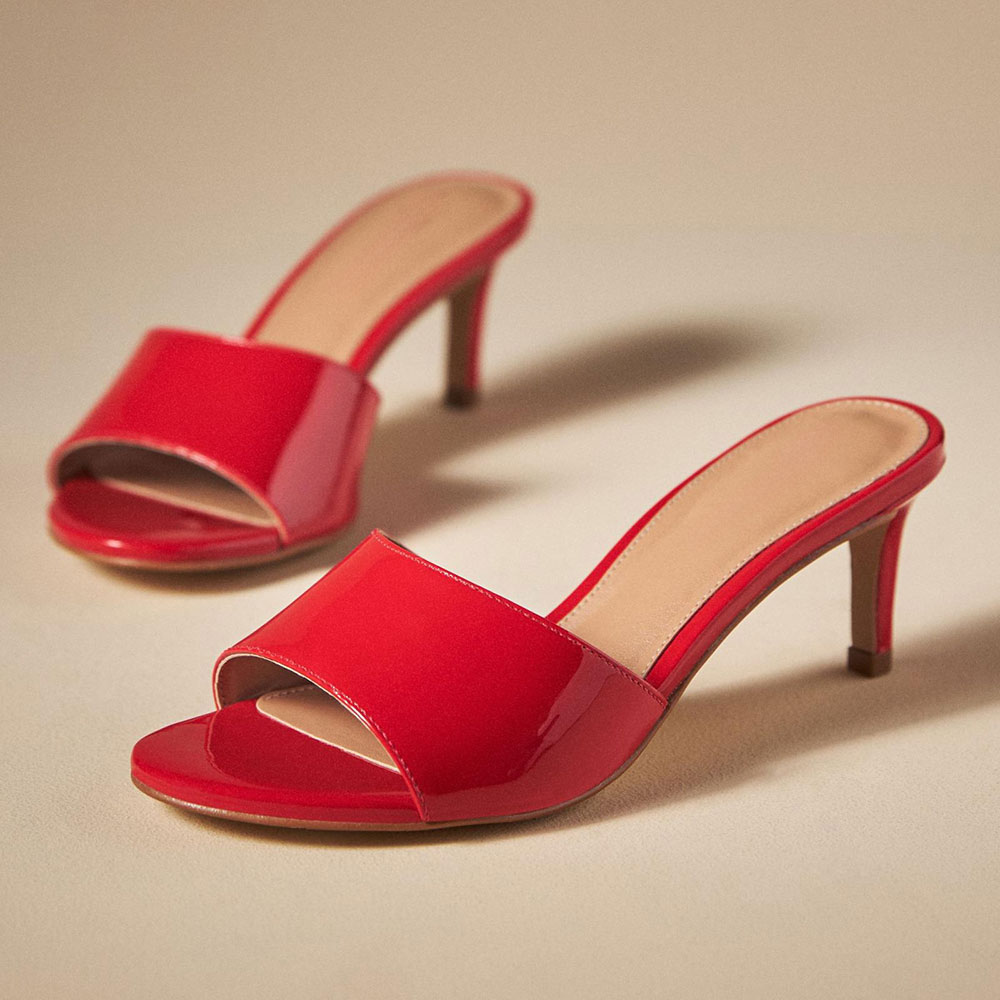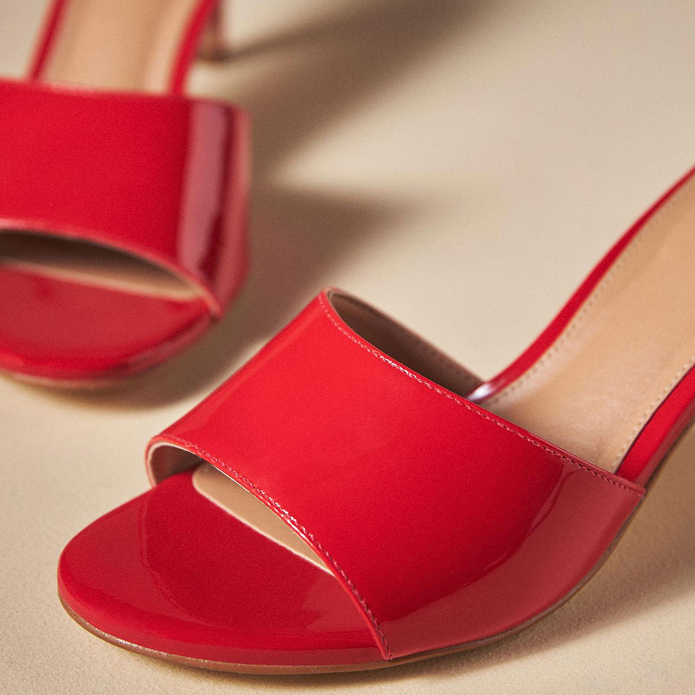 YDN Simple Red Patent Leather Open-Toe Kitten Heel Mules for Women