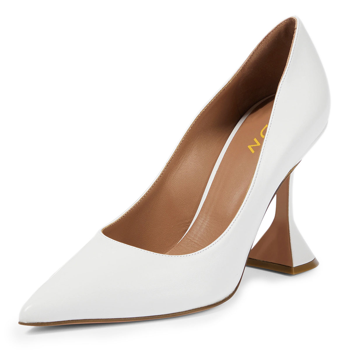 Special Designs: The white pumps feature flared heels and a pointed-toe design.