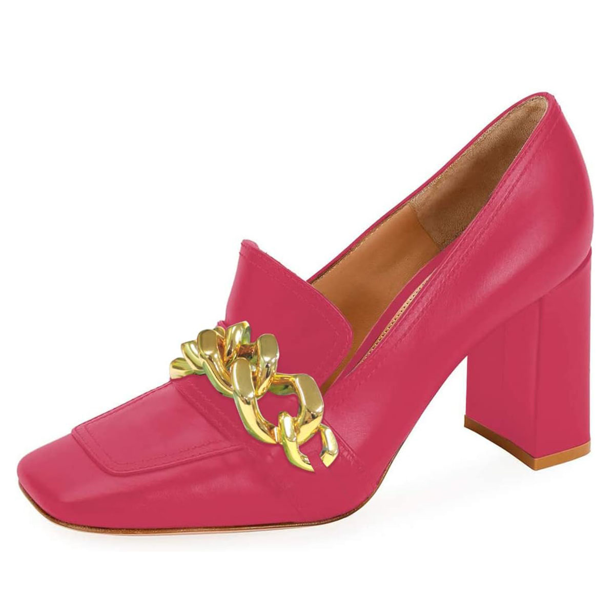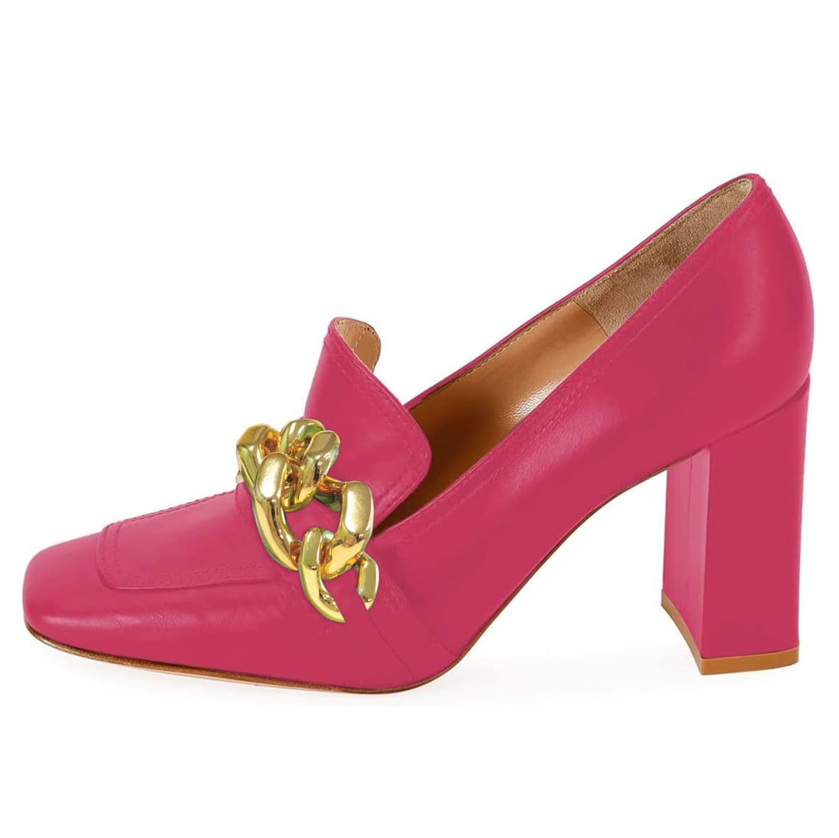 YDN Square Toe Gold Chain Pull-On Loafer Heels in Magenta