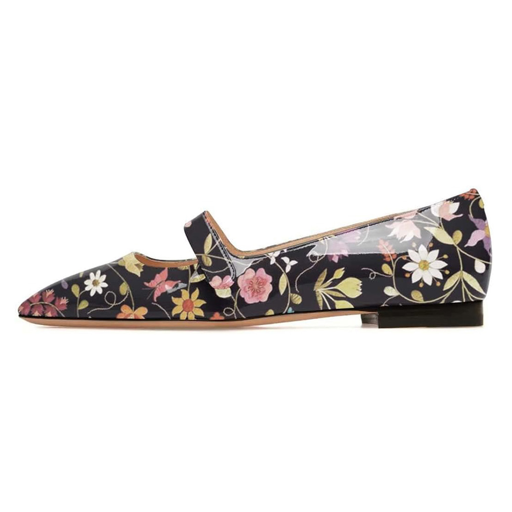 Special Designs: The Mary Jane flats feature a square toe and a multicolor floral print design.