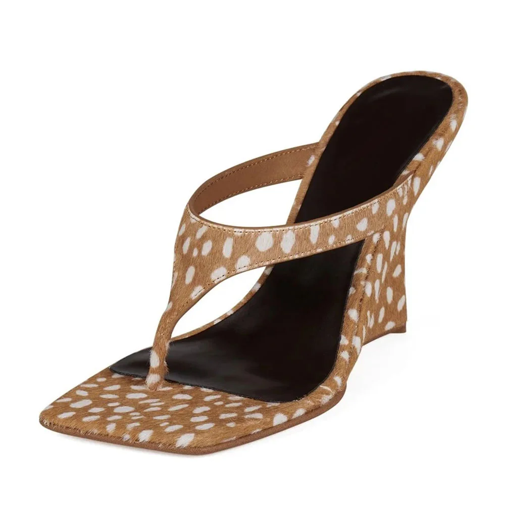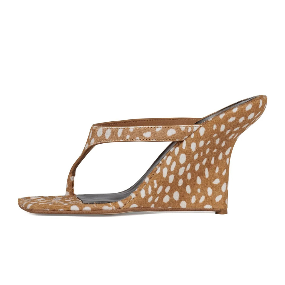 YDN Tan & White Spots Open Square Toe Flip Flop Wedge Sandals