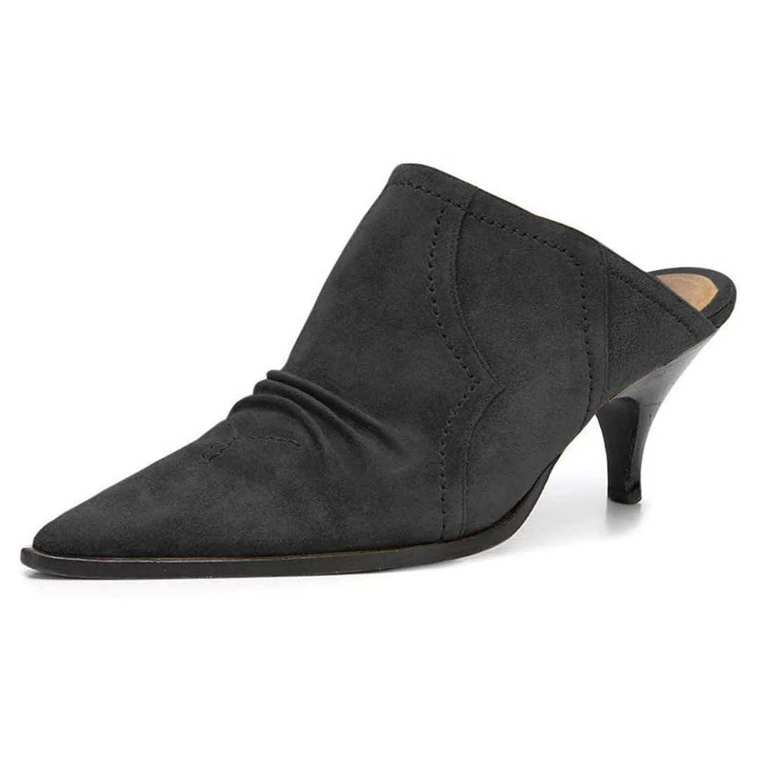 YDN Vegan Suede Kitten Heel Simple Pointy Toe Mules in Black