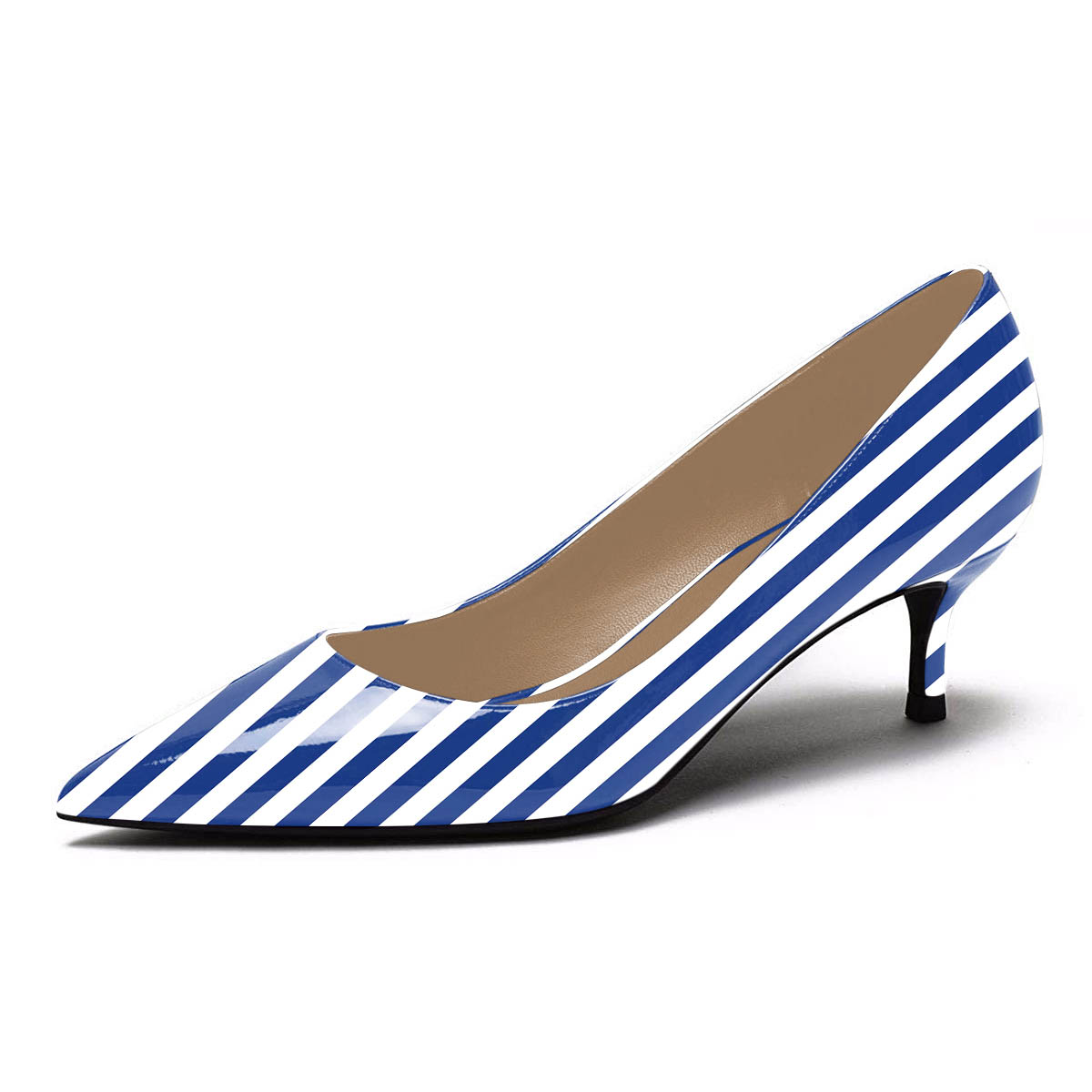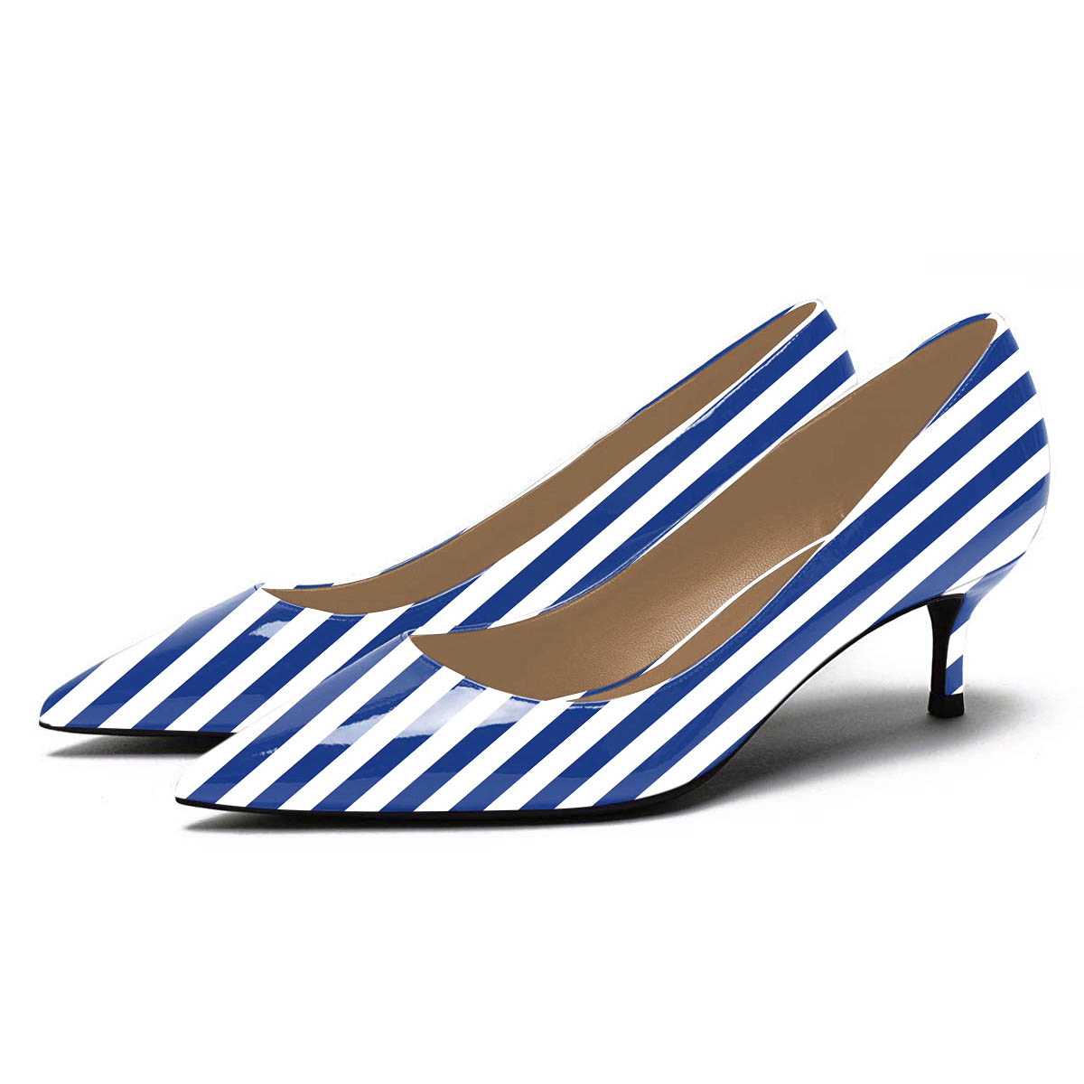 YDN White & Blue Stripes Kitten Heel Patent Leather Pumps for Women