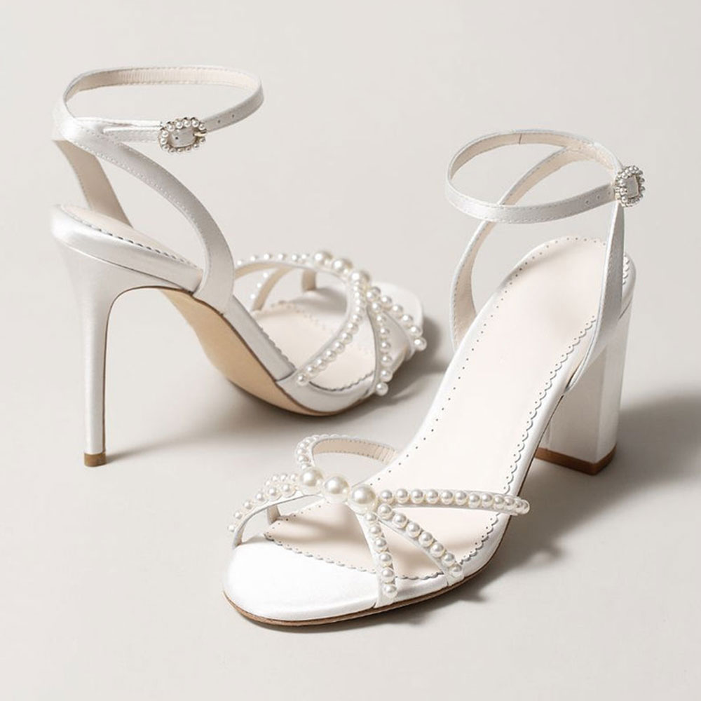 YDN White Satin Open Toe Ankle Strap Chunky Heel Pearl Sandals