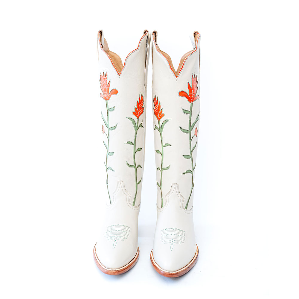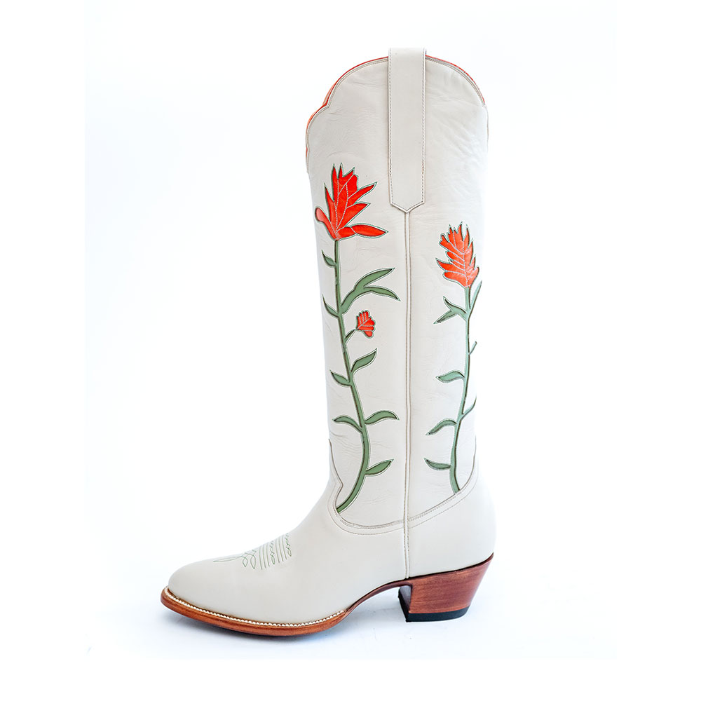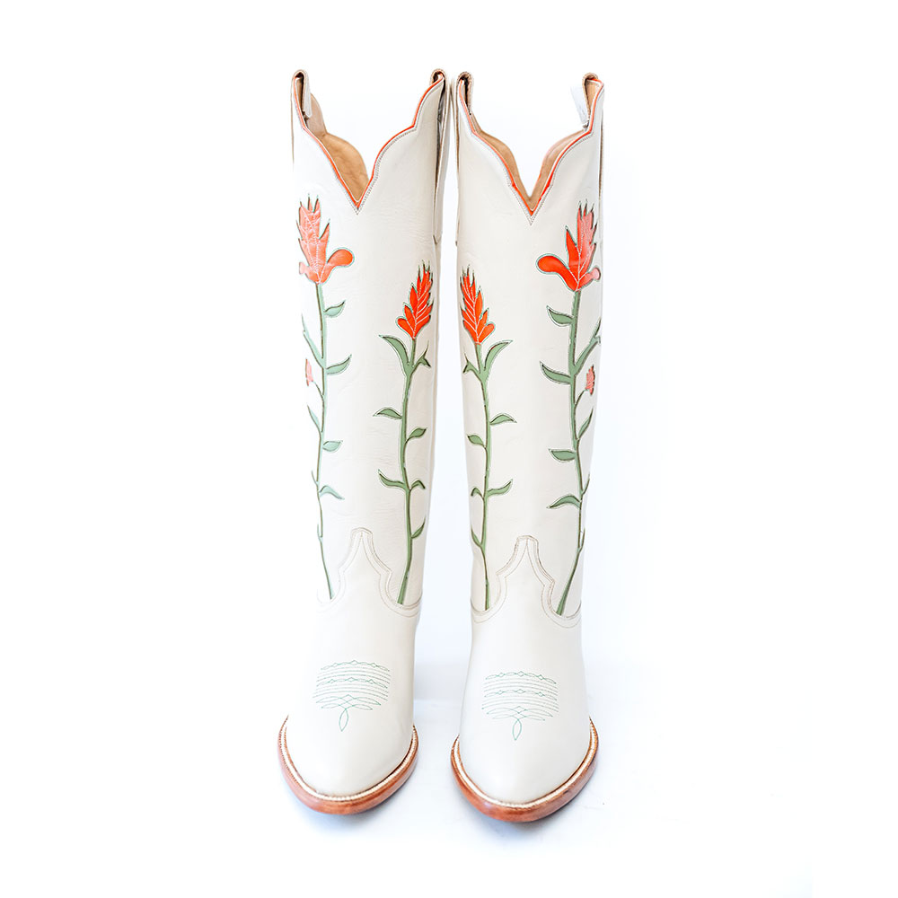 Special Designs: The closed-toe knee-high cowboy boots feature comfortable chunky heels and a floral inlay design.